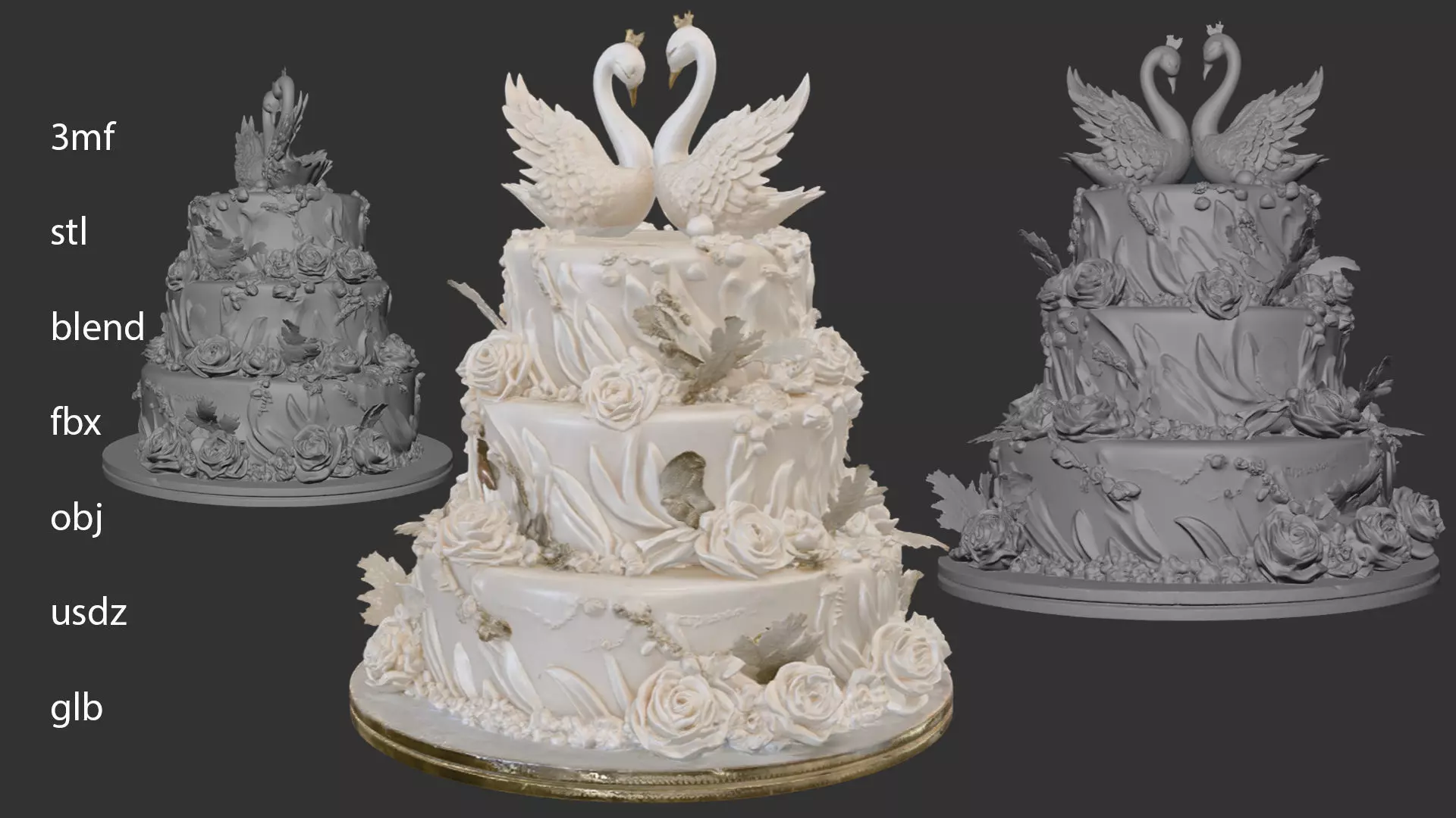 wedding cake, 3d printable cake, swan topper, floral wedding stl, majestic swans, miniature food, bakery display stl, rose sculpture, celebration figurine, 3 tier cake, realistic cake stl, fake cake, anniversary gift, wedding souvenir, high detail stl, resizable model, party centerpiece, romantic decor, swan figurine, luxury wedding art