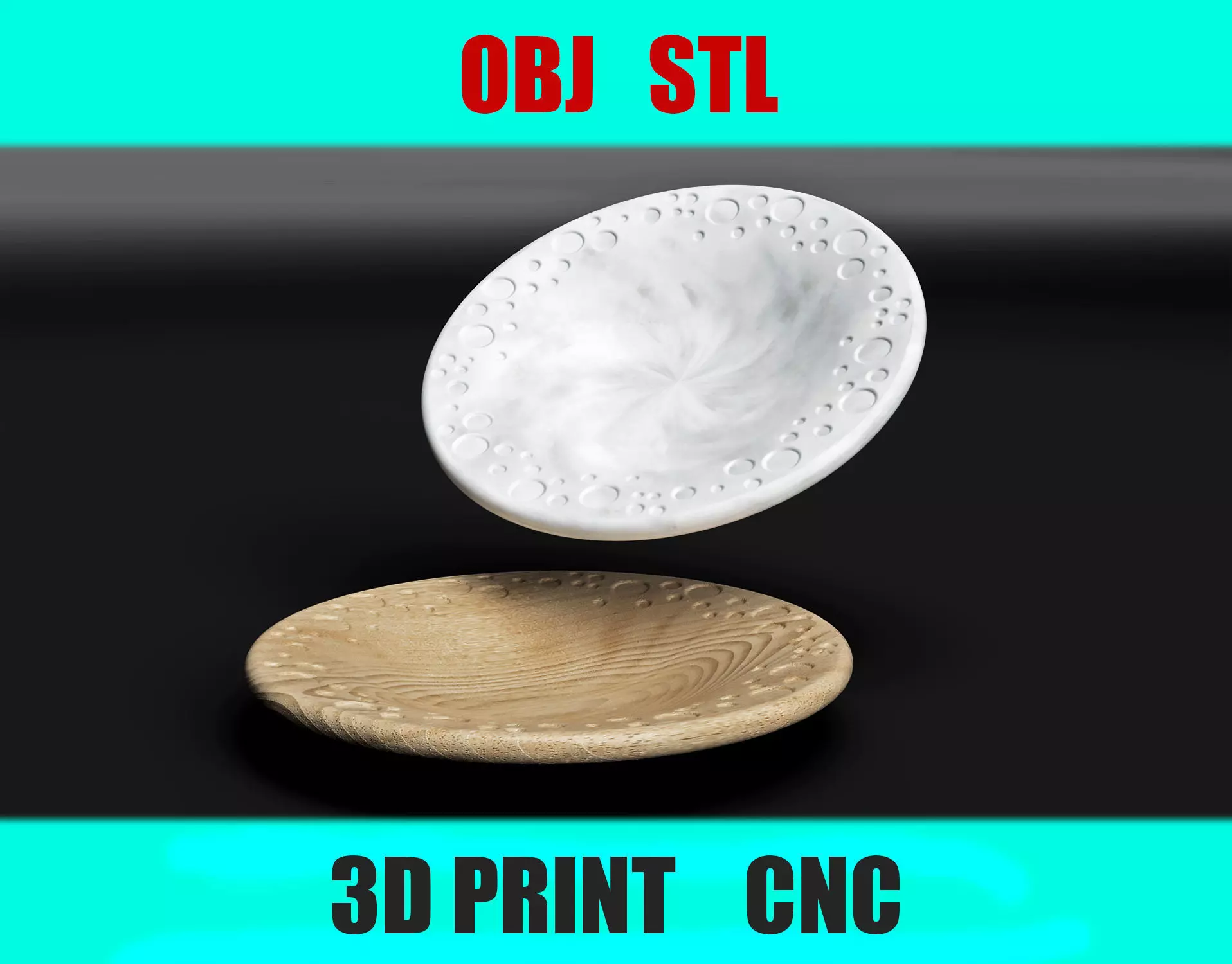 This digital 3D model of a decorative plate features a unique water drop-inspired relief design, resembling craters formed by falling droplets. Perfect for 3D printing or CNC machining, it’s ideal for stylish home decor, gifts, or functional plates.