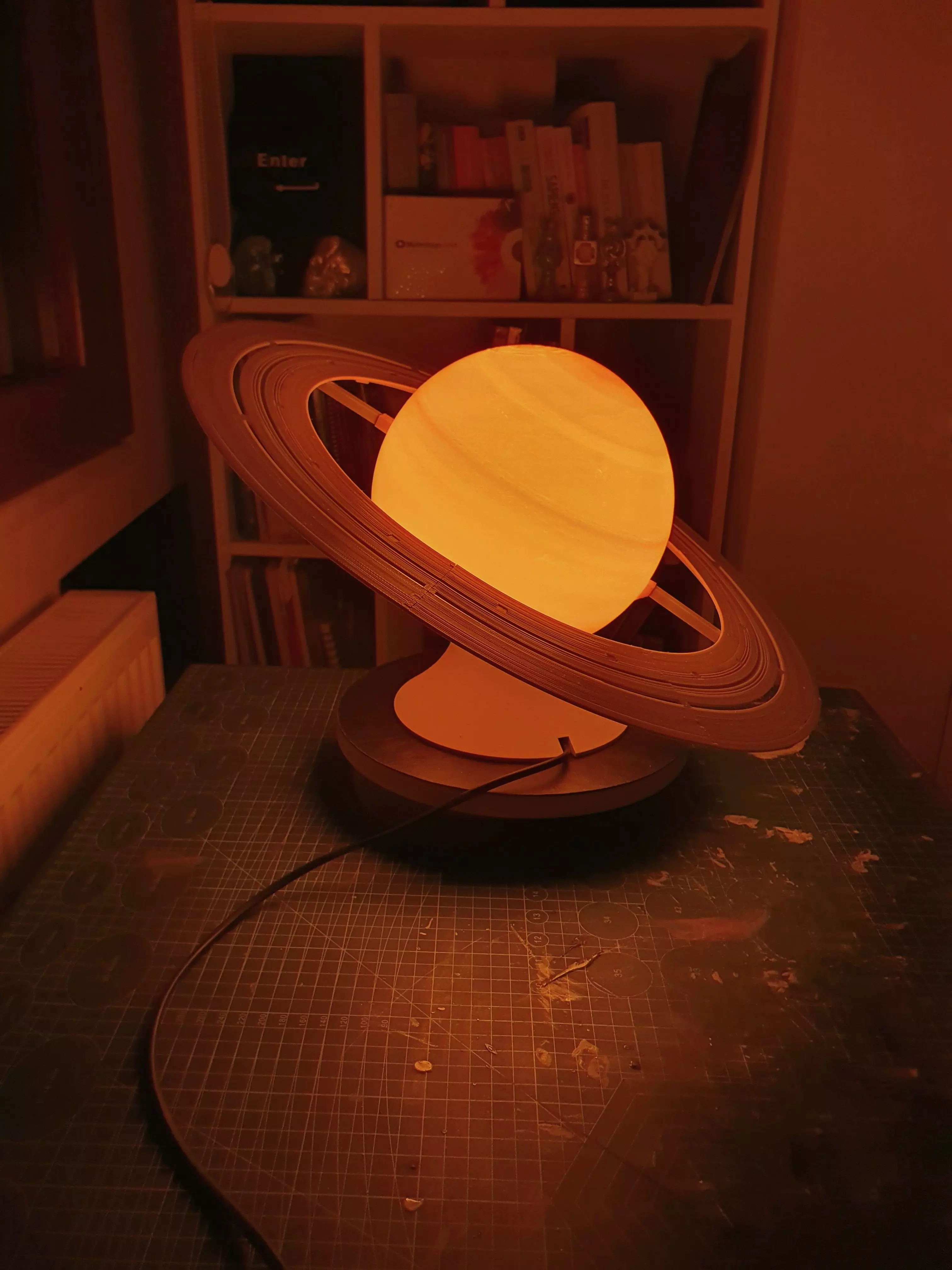 Saturn Lamp, one of the Planet Lamp series. There is no paint. Thanks to its 3D modeled reliefs, when a light bulb turned on inside, it gives the silhouette of the Saturn. A nice decoration and night lamp in my opinion :) Perfect for astronomy and astrology lovers.