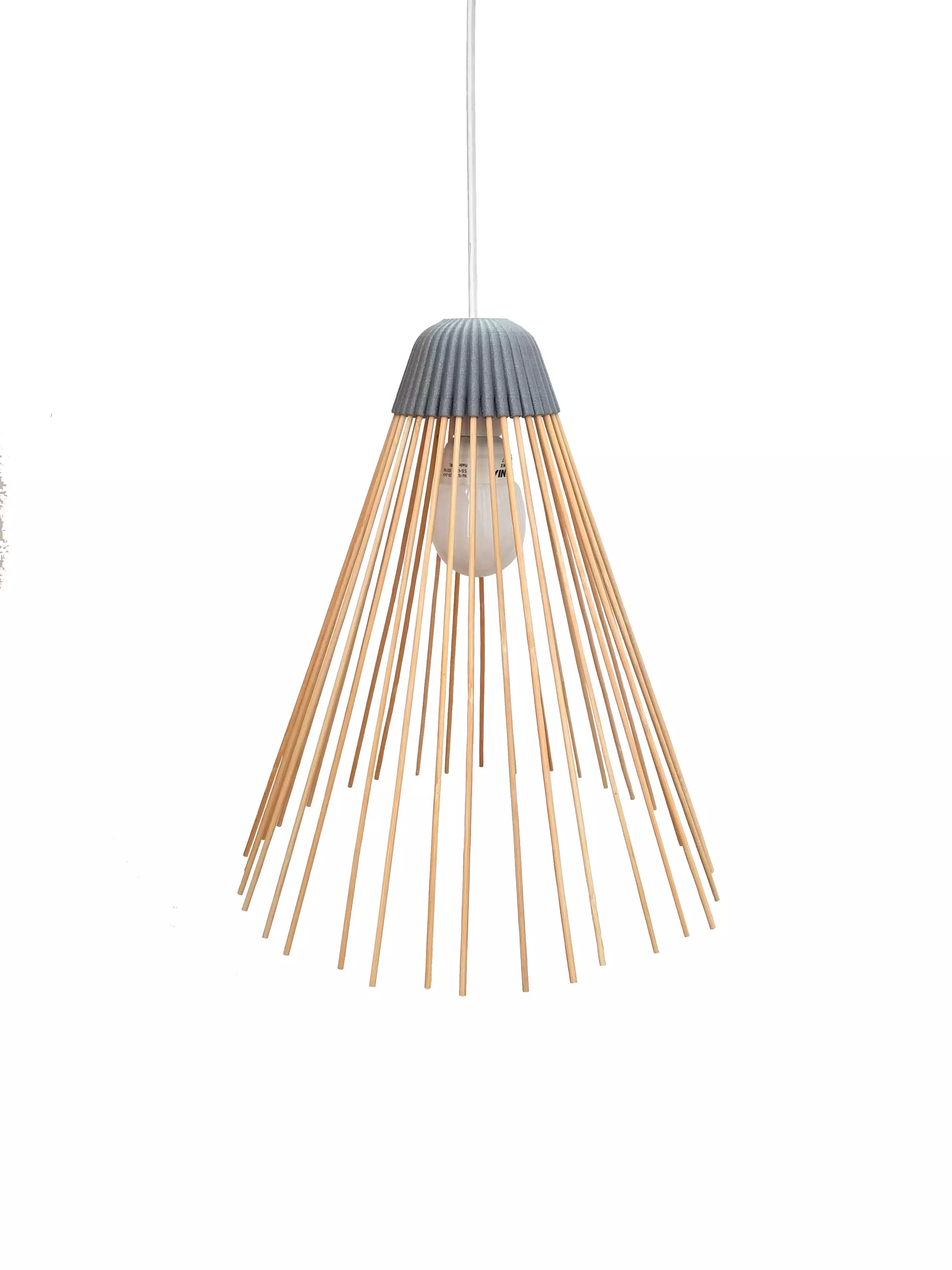DESCRIPTIONThis is PrimoMaggio, a 3D printable DIY lampshade structure to be applied to any hanging light cord that you need to complete just inserting 36 barbecue bamboo sticks for the decorative part whose lenght can be customized ad lib.