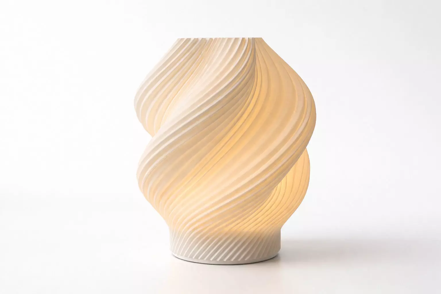 A parametric spiral lamp designed to create a warm, soft glow through its translucent structure.