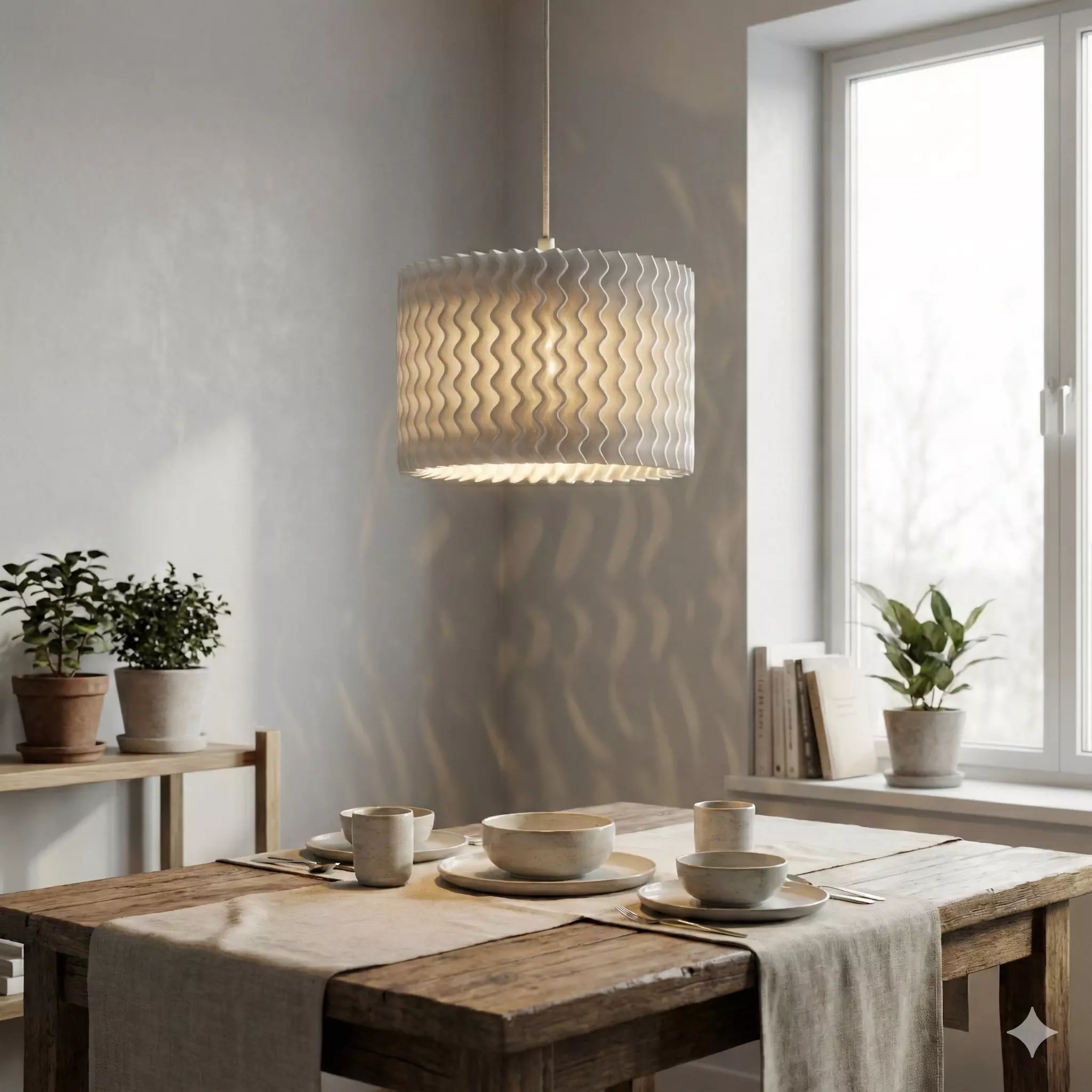 PRODUCT DESCRIPTION The Wavy Pendant Light by Goozo Design transforms your 3D printer into a manufacturing tool. The model features a unique geometric structure that creates stunning shadow plays when lit. It is designed to visually resemble a high-end designer product but is engineered specifically for efficient FDM printing.