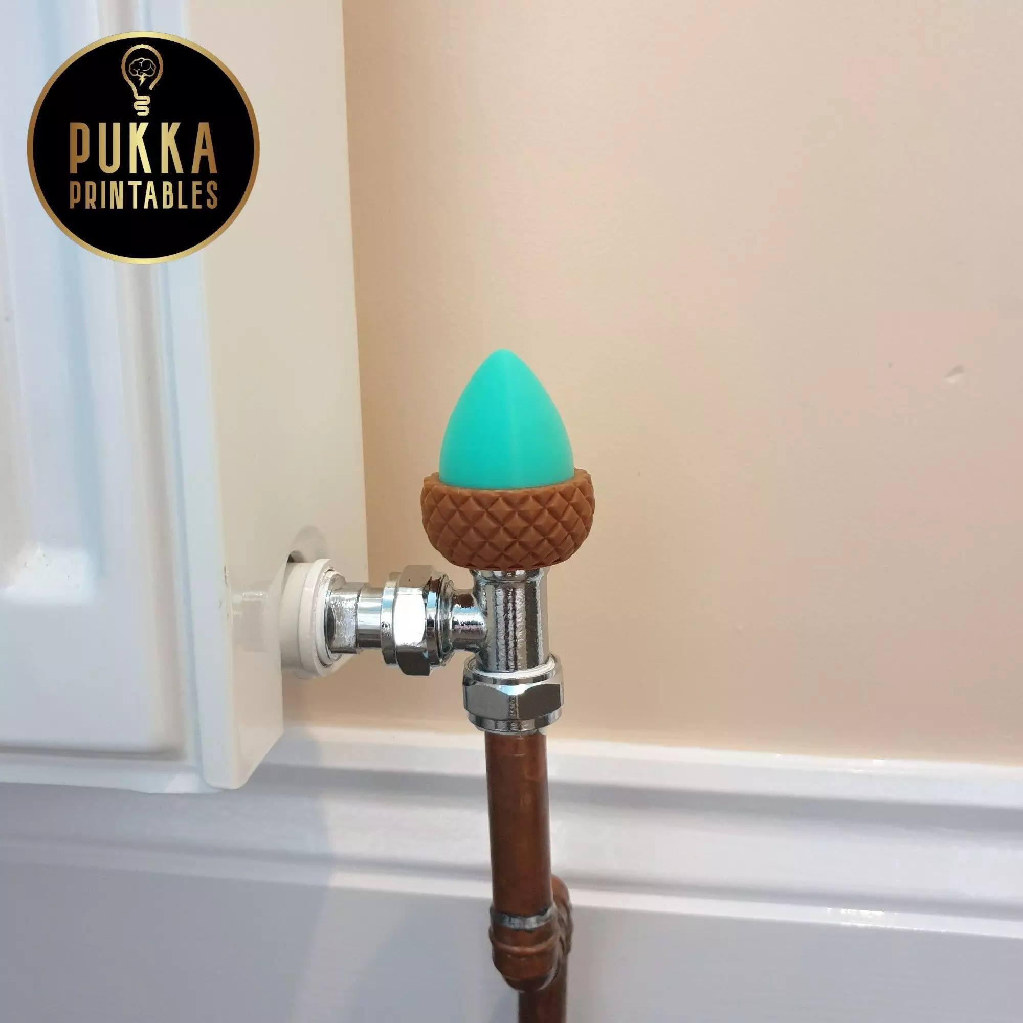 Measure your radiator valve before printing to select the correct size.The model can be printed in a single colour or with a filament change to highlight the acorn cap detail.Standard PLA or PETG materials are suitable for indoor decorative use.