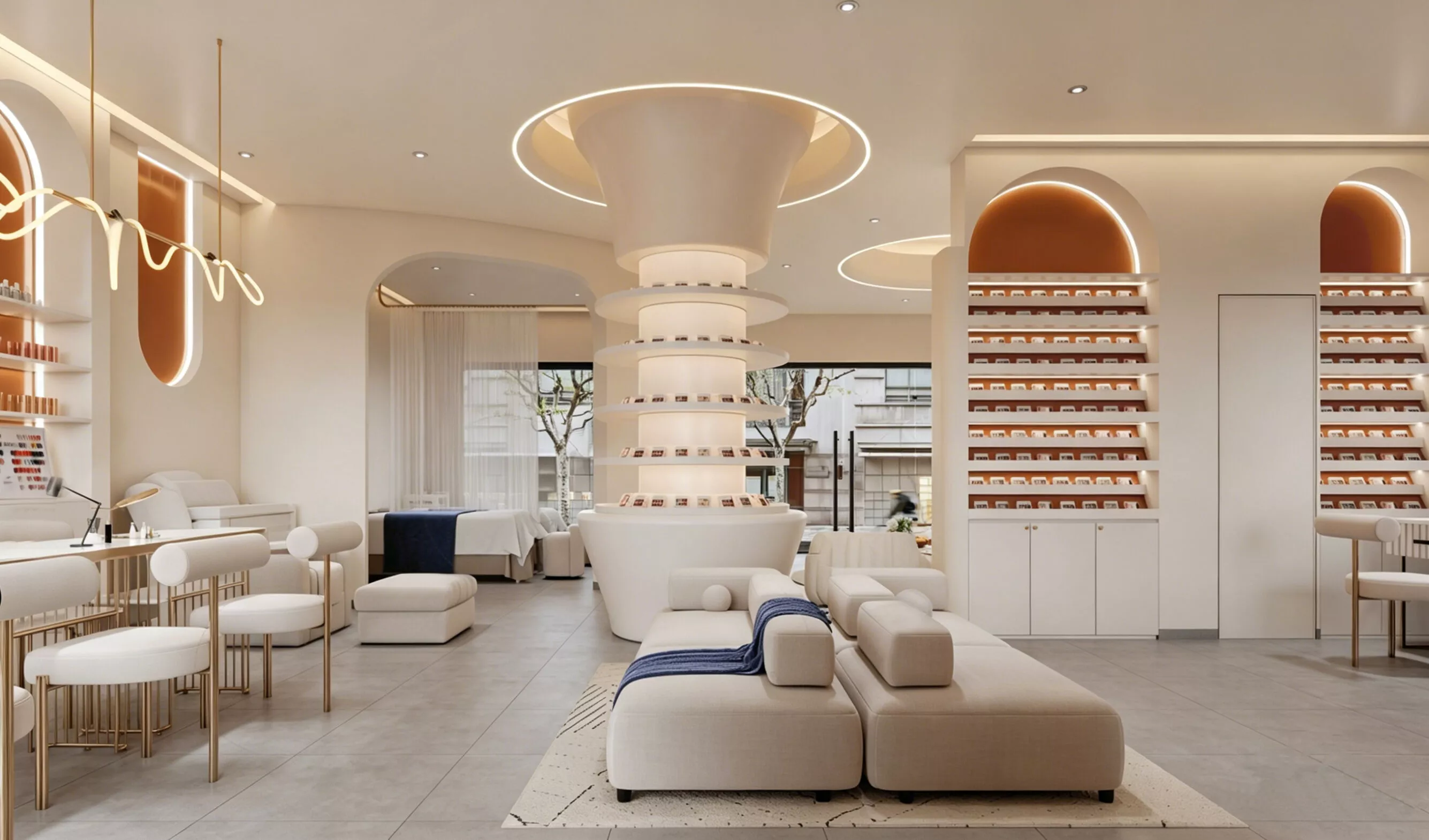 This fully furnished asset features a warm, elegant layout with a striking central circular product display tower, arched wall shelving for product storage, dedicated manicure stations with ergonomic seating, private treatment rooms with massage beds, and a cozy guest lounge area. The space is complemented by soft ambient lighting, arched architectural details, and a neutral, luxurious color palette, creating a welcoming, premium atmosphere perfect for beauty salons, nail spas, and wellness retail stores.