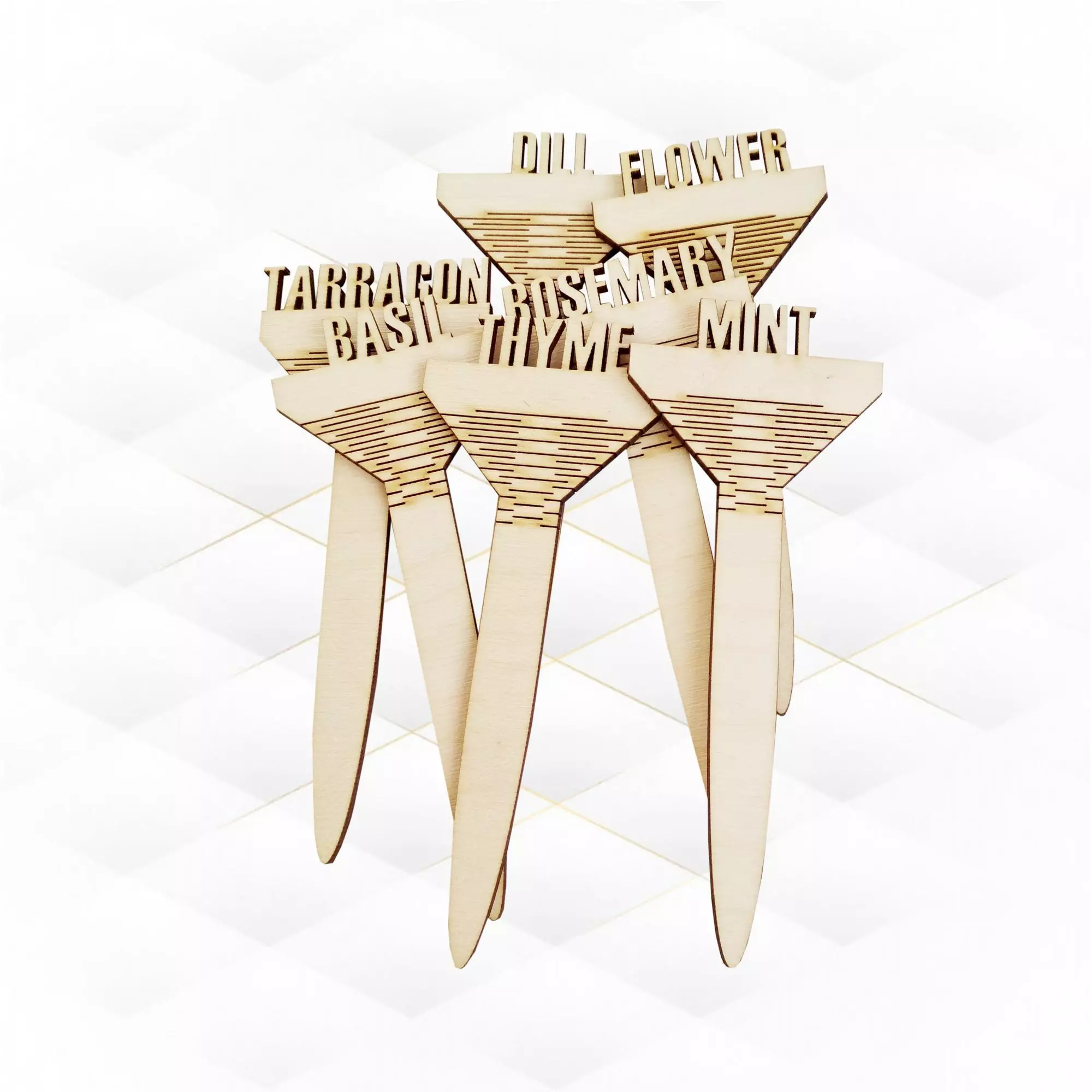Files for cutting Garden Stakes for 3mm material thickness are included. Without glue for assembly!The photographs show a design Marker Plant made of 3 mm plywood with dimensions:150x60 mm (2.4x5.9 inches)