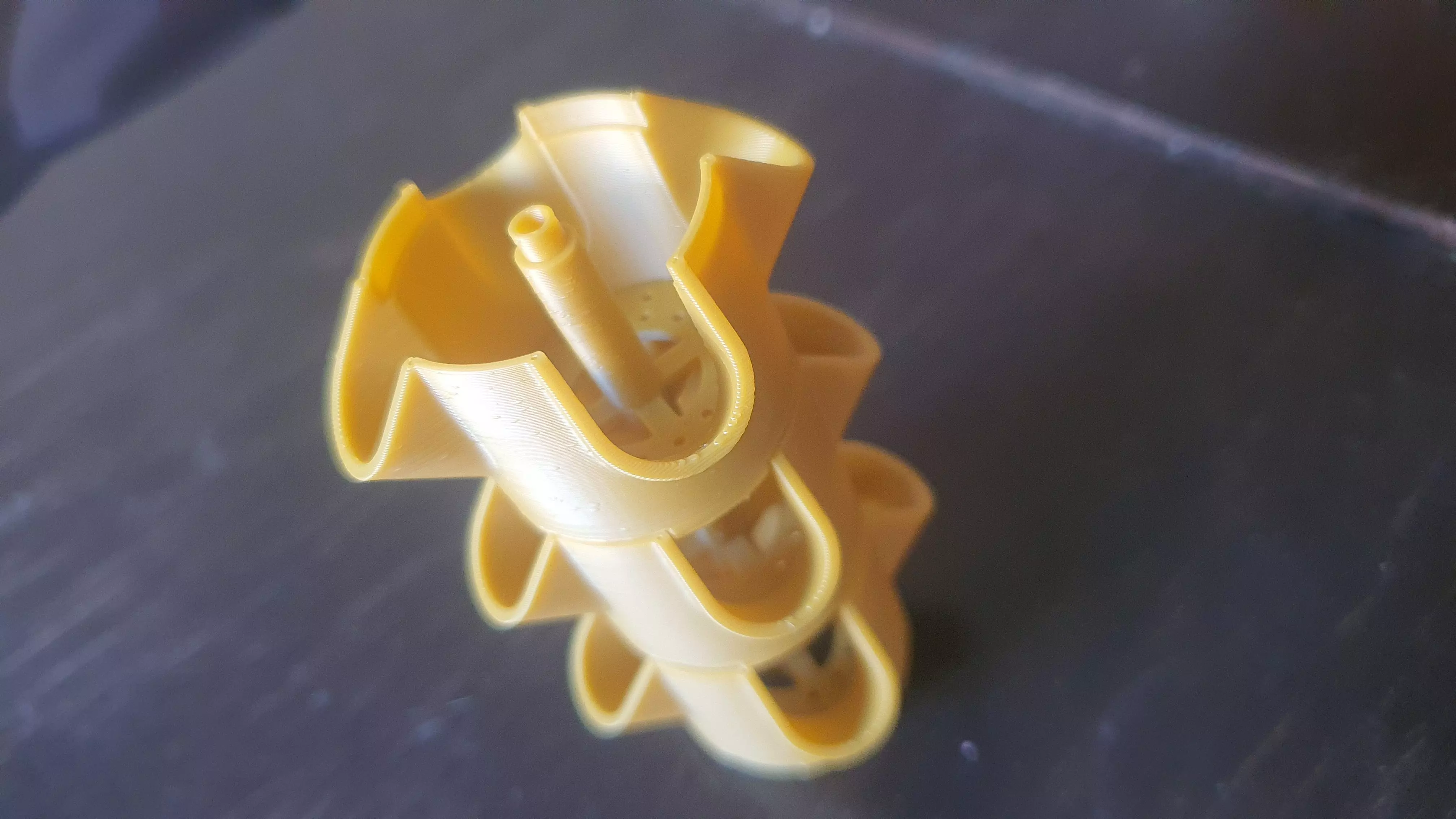 This is a model for a hydroponic tower which can be 3D printed, this part is the main stackable piece and multiple of them can be sacked on top of each other at a 45° rotation angle to alter the pockets between each two pieces for better plants growth. the parts are designed to fit snag either the outer perimiter or the inner tube for water flow although this one might need some form of sealing if needed (not tested yet).