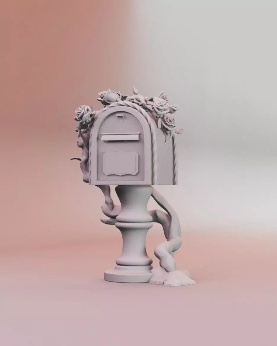 A charming miniature 1:12 scale mailbox, adorned with delicate roses and a twisting vine, blending vintage elegance with a whimsical touch. Perfect for dollhouses, fairy gardens, or dioramas, it adds a storybook feel to any scene.