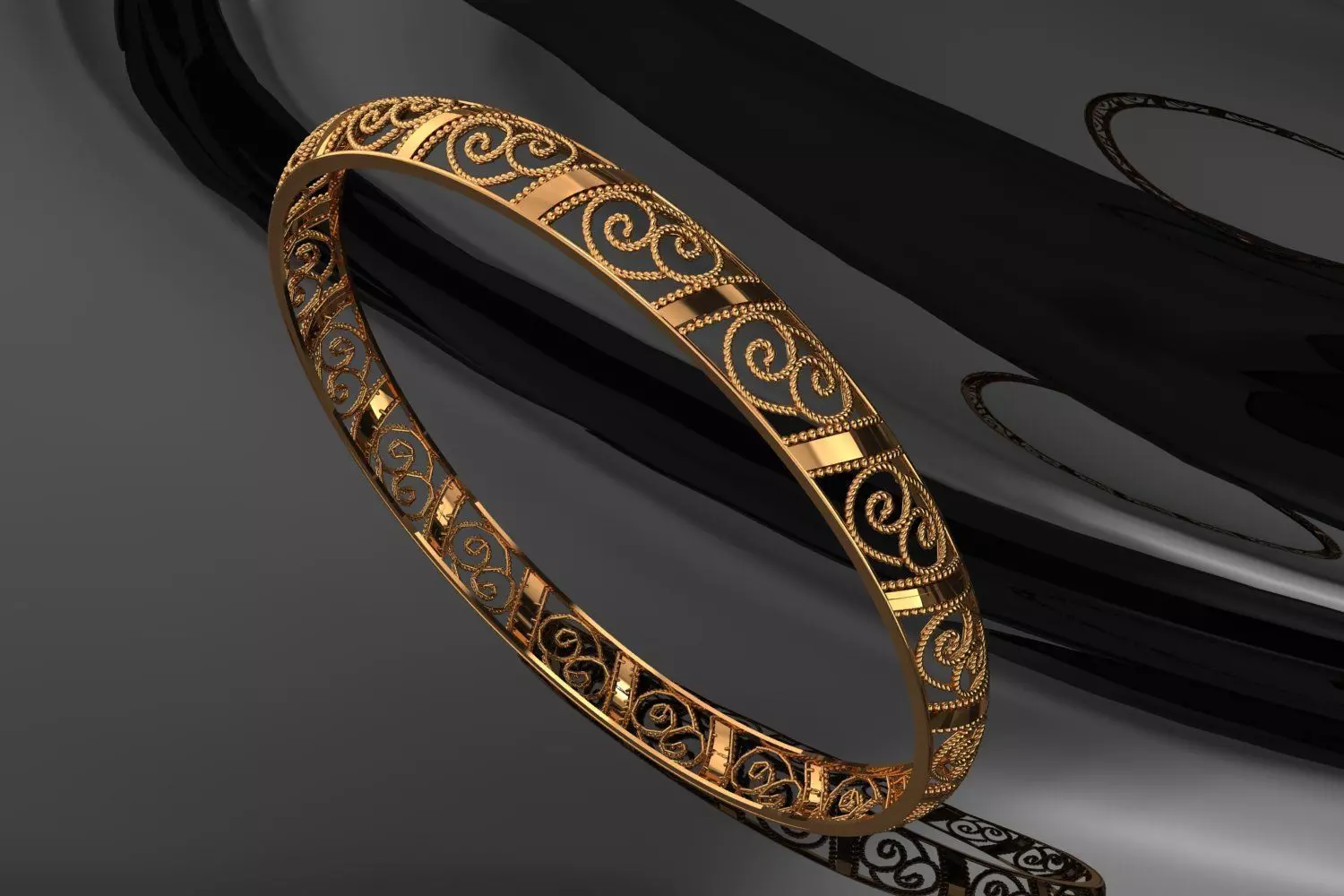 This 3D model presents a meticulously crafted gold bangle, characterized by its exquisite openwork filigree design. The bangle features a continuous, intricate pattern of symmetrical scrolls and swirls, alternating with finely beaded sections that add sparkle. The design is a harmonious blend of classic elegance and detailed artistry, making it a versatile piece suitable for various occasions, from daily wear to special events.
