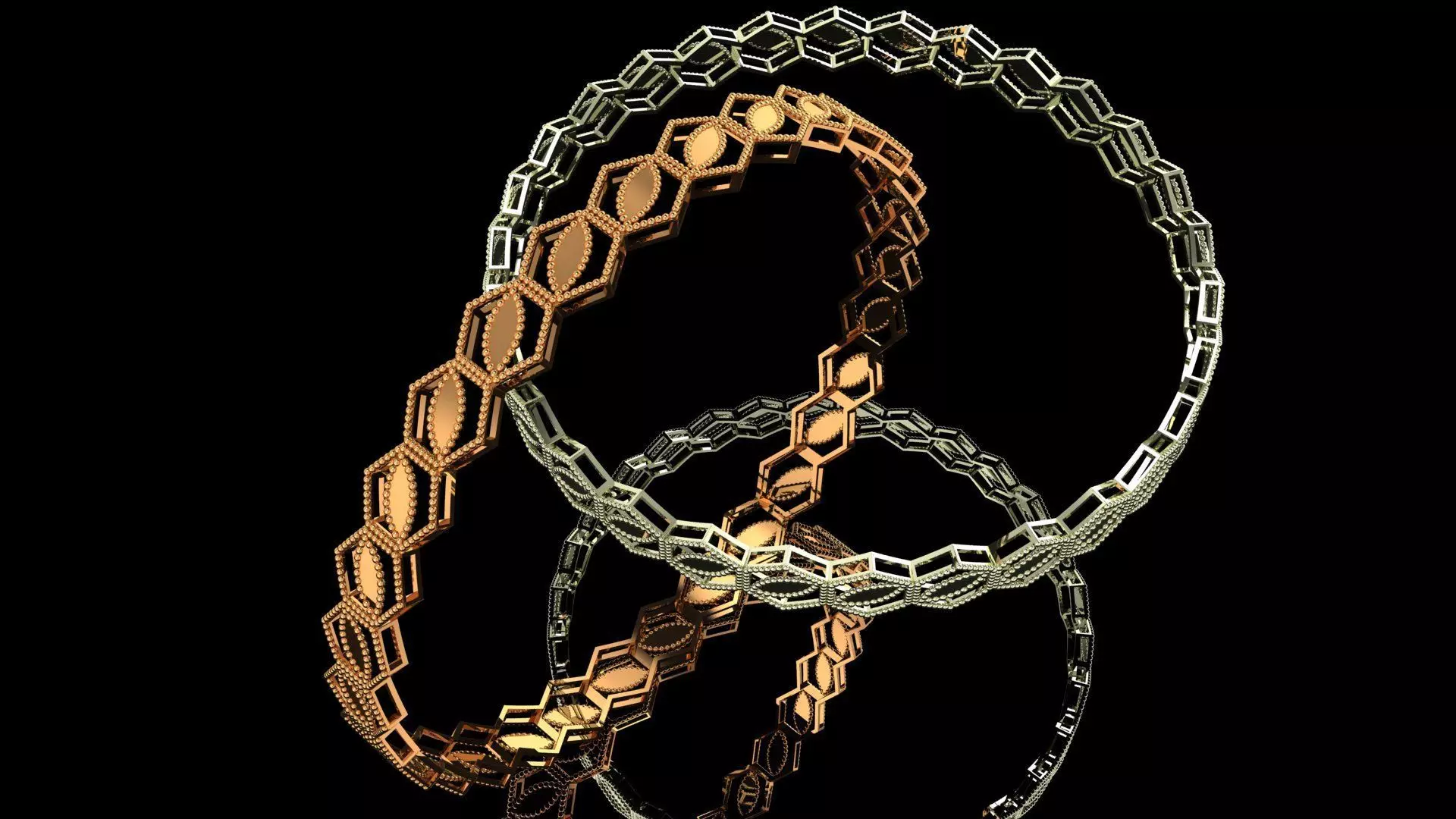 This 3D model features a contemporary gold bangle composed of repeating, elongated hexagonal or lozenge-shaped segments. These segments are seamlessly connected by smaller links, creating an openwork or lattice-like structure that is both visually striking and comfortable to wear. This design offers a unique blend of geometric precision and flowing elegance, ideal for manufacturers seeking to produce modern and sophisticated bangles.