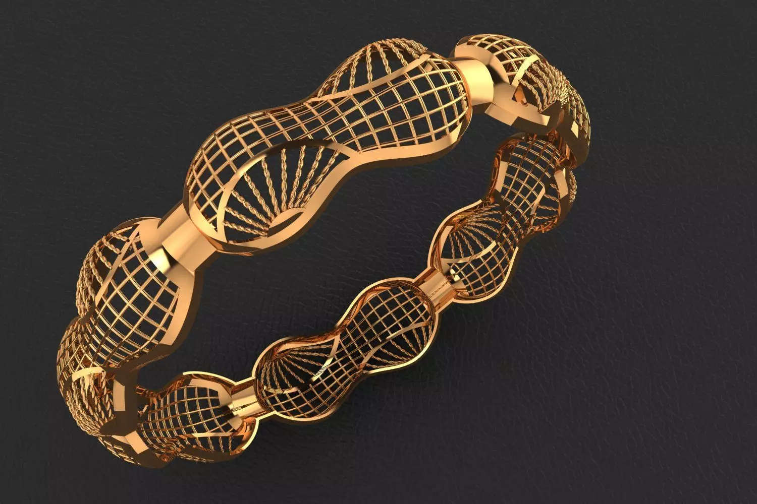 This 3D model presents a contemporary and sophisticated bangle design, characterized by its unique undulating form and intricate openwork lattice pattern. The design combines organic curves with precise geometric detailing, offering a visually striking and versatile piece for modern jewelry collections. The absence of stones simplifies manufacturing while highlighting the craftsmanship of the metalwork itself.