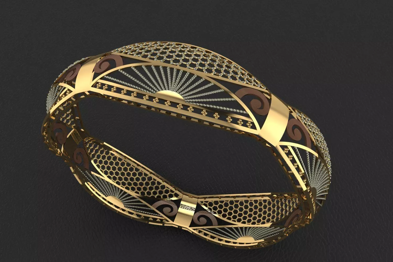 This 3D bangle model showcases a sophisticated fusion of traditional motifs and modern engineering, ideal for high-end jewelry manufacturing. Designed with a dynamic twisted form, the bangle features alternating sections of intricate honeycomb lattice, radiating sunburst patterns, and swirling filigree-style elements.