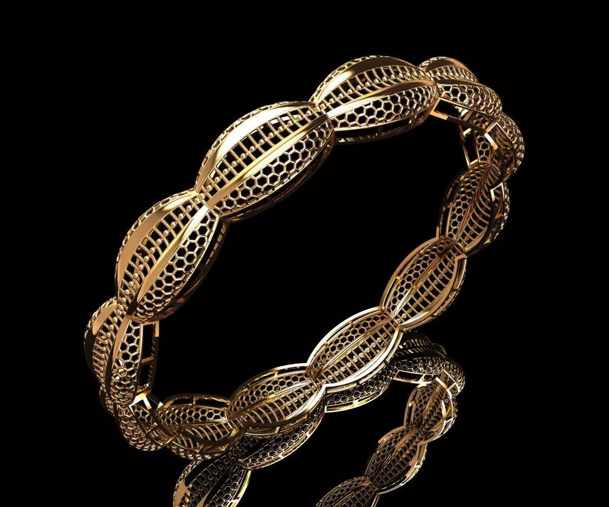 The bangle is composed of interconnected oval-shaped segments, each featuring a detailed lattice pattern with hexagonal and linear elements. The repeating oval geometry creates a continuous ornamental rhythm around the circumference. The design blends geometric precision with intricate filigree, making it suitable for fine jewelry casting and finishing.