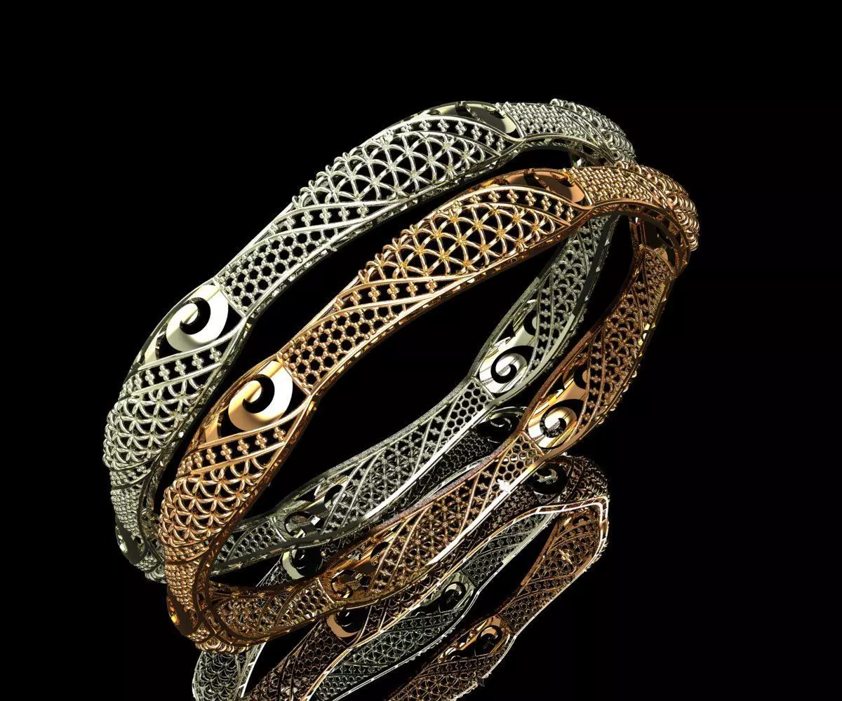 The bangle features a combination of gold and silver tones, arranged in alternating curved segments with intricate lattice and filigree detailing. Spiral motifs in black and white accentuate the ornamental flow, creating a dynamic interplay of textures and tones. The design is symmetrical, with repeating units that interlock seamlessly around the circumference.