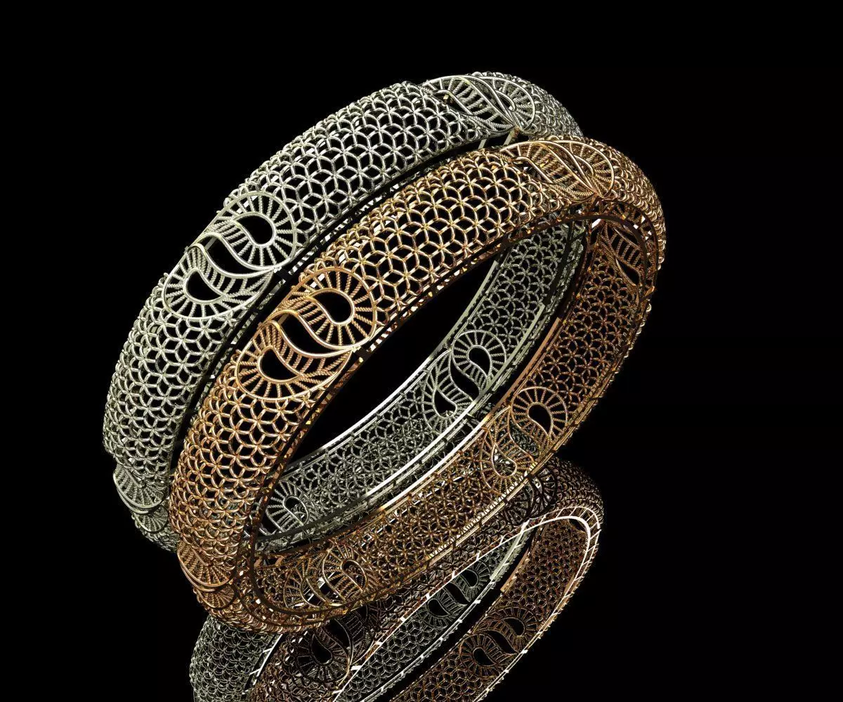 The bangle features an interwoven-loop filigree pattern with repeating geometric lace-like motifs along the circumference. The structure is symmetrical, with alternating openwork cutouts and raised borders, creating a lightweight yet durable form.