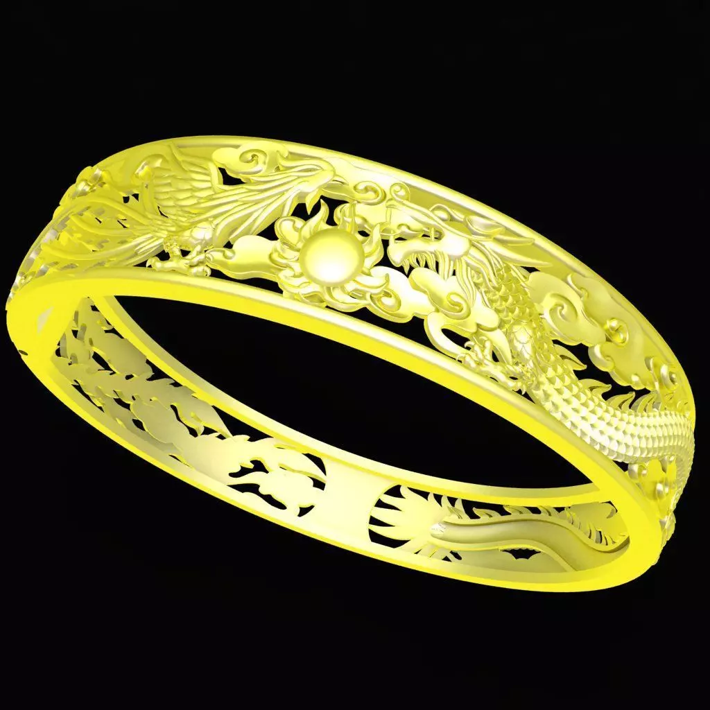 This Oriental Dragon Phoenix Openwork Bangle is a finely crafted 3D jewelry model designed for high-quality production and premium custom pieces. The design features a majestic dragon and an elegant phoenix intertwined around the band, symbolizing balance, harmony, prosperity, and powerful energy in traditional Asian culture. The openwork style enhances the visual depth of the bangle, adding a refined sense of luxury while maintaining a lightweight structure suitable for casting in gold, silver, or platinum.