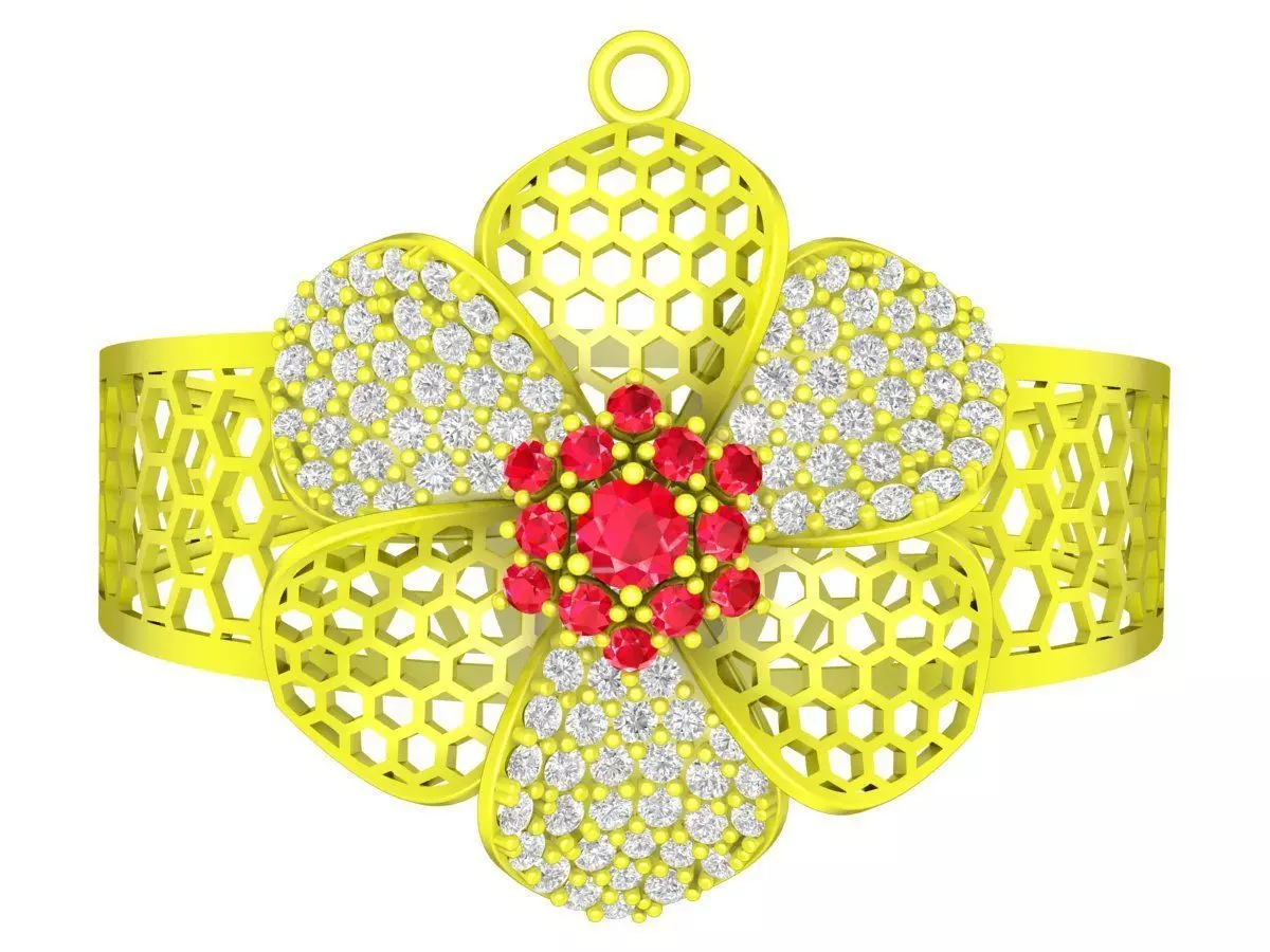 This luxury floral openwork cuff ring 3D jewelry model features a bold flower-inspired centerpiece with a clustered center stone arrangement and pavé-set petals. The open lattice band design provides a lightweight structure while maintaining visual richness and structural stability.