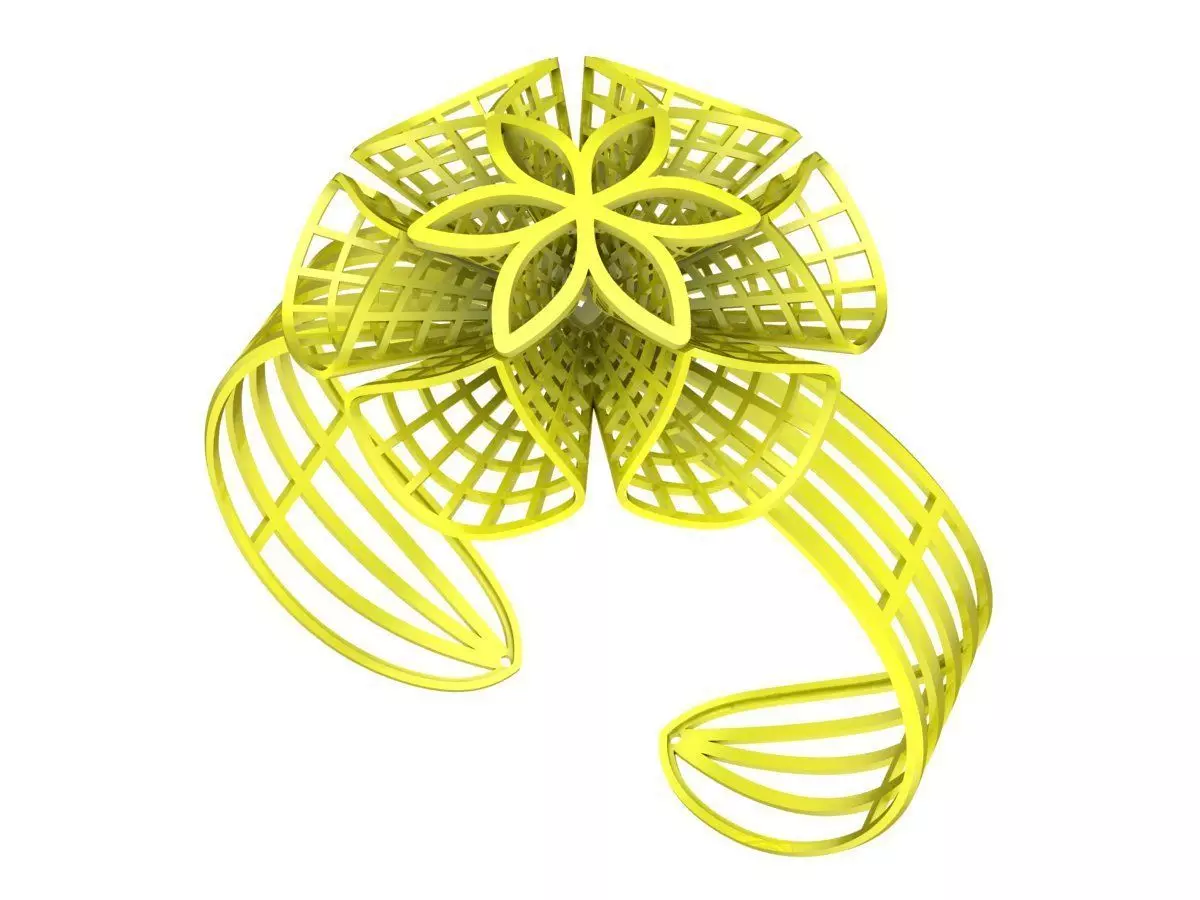 This floral wire cuff ring 3D jewelry model features an elegant open bangle structure combined with a symmetrical flower motif. The design is inspired by artistic wire jewelry, creating a light, airy appearance while maintaining a strong and balanced structure for production.