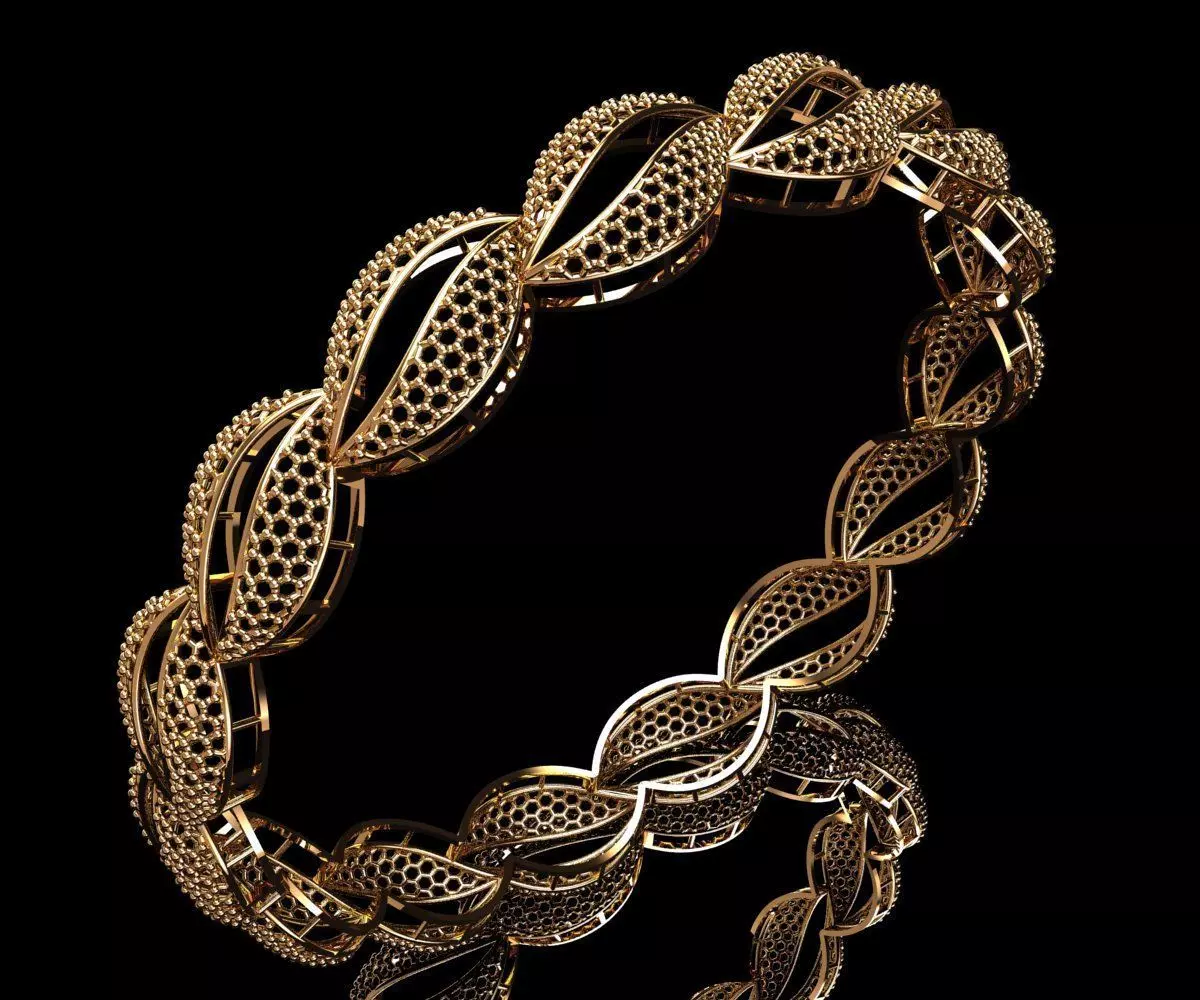 This meticulously crafted 3D model showcases a sophisticated woven or braided gold bangle design. 1 The intricate interlacing pattern creates a visually appealing texture and a sense of fluid movement. The openwork elements within the design offer a delicate yet substantial feel, allowing for light play and highlighting the precious metal. This design is ideal for manufacturers looking to produce a high-impact statement piece that balances modern aesthetics with timeless elegance. The model is provided with precise dimensions and detail suitable for casting and finishing.