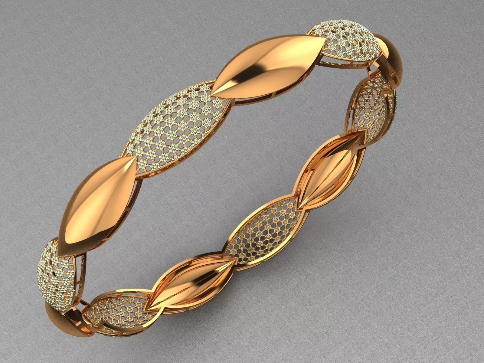 Immerse yourself in the exquisite artistry of this 3D-modeled gold bangle, a true testament to masterful craftsmanship and innovative design. The bangle features a mesmerizing array of intricately intertwined leaf motifs, each one meticulously sculpted to capture the delicate veins and natural curvature found in real foliage. The seamless flow of leaves creates a harmonious circle that gracefully wraps around the wrist, embodying both elegance and the eternal beauty of nature.