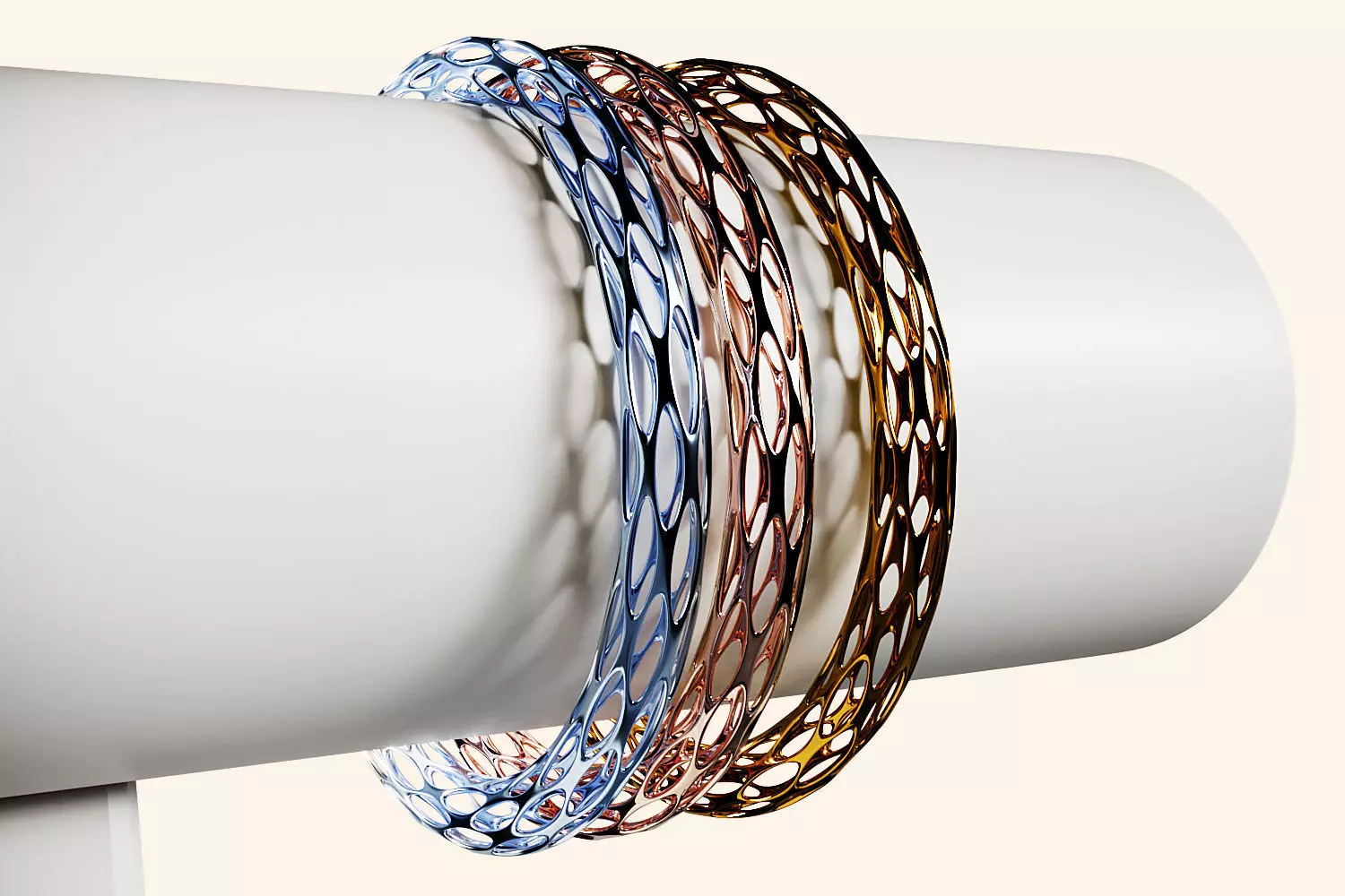 3d printed jewelry. Futuristic, Voronoi, openwork, hoop bracelet (armlet). This bracelet is for the wrist of medium thickness. BLEND, FBX, OBJ and STL Files.X - 19,3 cmY - 1,78 cmZ - 19,3 cmFaces - 154,104