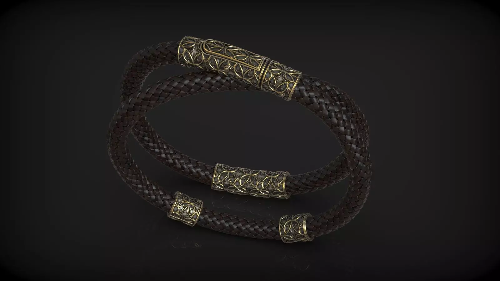 This 3D model represents an exquisite men's bracelet, meticulously crafted from braided leather cord and showcasing a captivating gothic design. The bracelet is a testament to fine craftsmanship and detailed artistry, featuring a prominent clasp that is richly adorned with gothic elements and intricate ornamentation. The clasp serves as the focal point of the piece, drawing the eye with its elaborate motifs reminiscent of gothic architecture.The clasp and its connecting elements are seamlessly integrated with the braided leather cord, ensuring both durability and aesthetic harmony. The braided leather cord itself is crafted from high-quality leather, tightly woven to create a sturdy yet flexible band that comfortably wraps around the wrist. This bracelet is not just a piece of jewelry; it is a statement of individuality and a tribute to the timeless allure of gothic artistry, perfect for those who appreciate unique and bold fashion choices.