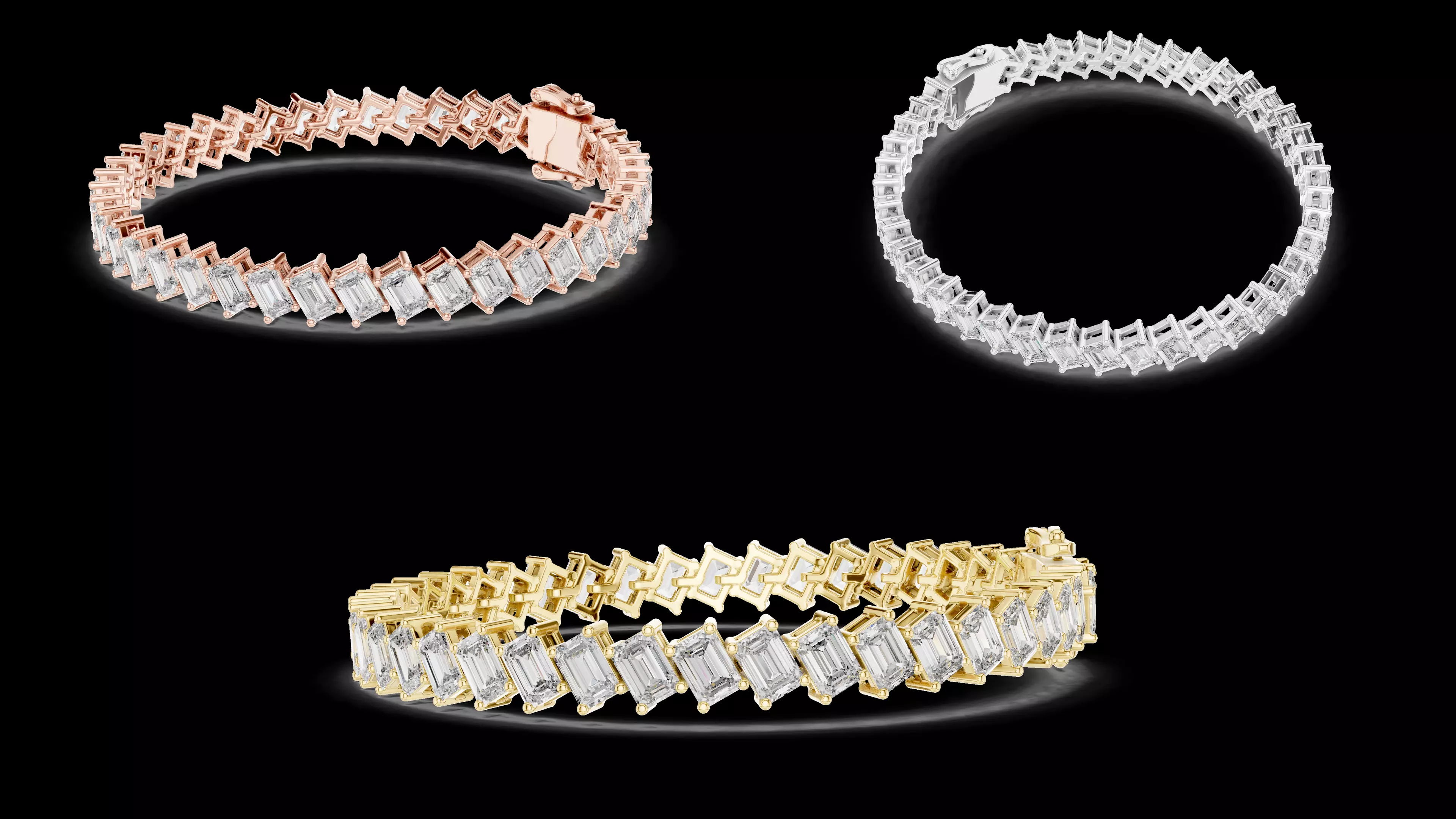 Emerald Cut Zigzag Diamond Bracelet 3DM STL is a bold and modern tennis-style jewellery CAD model designed for luxury manufacturing. This bracelet features a continuous row of emerald-cut diamonds arranged in a distinctive zigzag alignment, creating a dynamic and eye-catching pattern around the wrist.