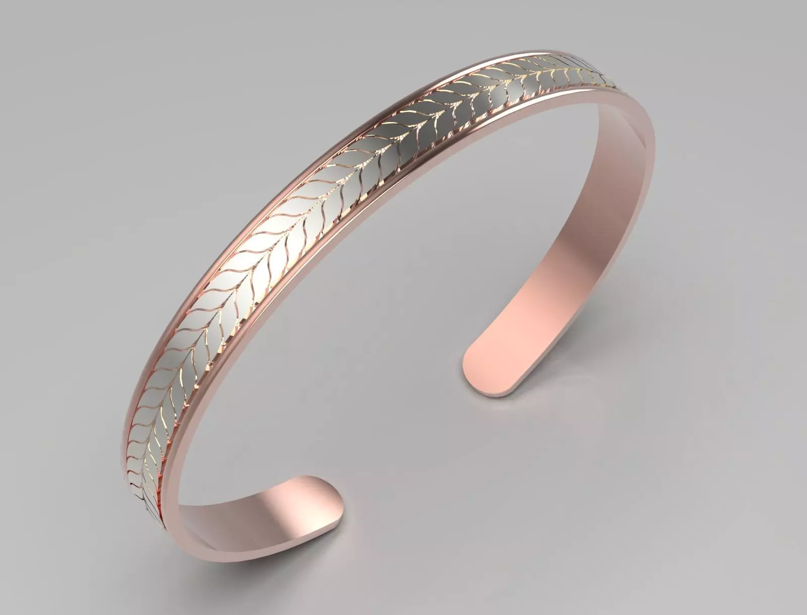 This image features a stylish cuff bracelet with a sleek design, mostly made of rose gold. The bracelet has a smooth, polished finish, while its center features a decorative plate engraved with a delicate leaf pattern that adds texture and visual interest. The combination of the sleek rose gold with intricate details creates an elegant look, making it suitable for both casual and formal occasions. This piece embodies a modern aesthetic while maintaining a timeless appeal.