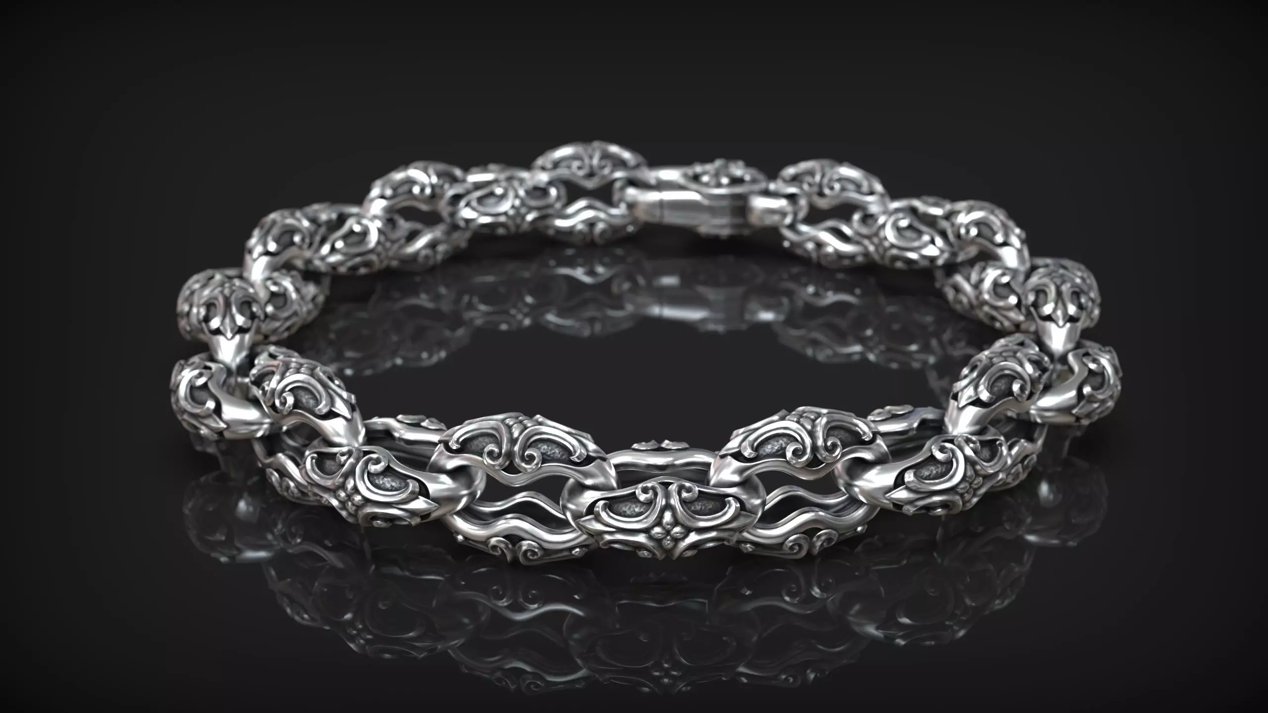 This 3D model showcases an intricately designed bracelet in a refined Gothic style. Each link of the chain features elaborate ornamental patterns inspired by medieval architecture and sacred art. The flowing shapes and symmetrical motifs create a sense of elegance, mystery, and timeless craftsmanship. The bracelet’s design combines smooth metallic surfaces with deep relief engravings, producing a sophisticated play of light and shadow.