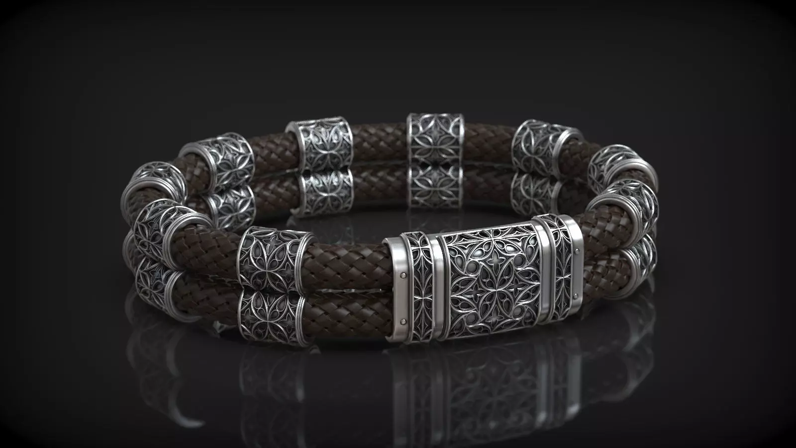 And here's a new one striking 3D model of a large men's bracelet, designed in an intricate Gothic style. This captivating piece showcases the characteristic elements and details of Gothic design, creating a bold and elegant statement.The bracelet features a clasp and decorative elements in the form of double barrels, adorned with elaborate Gothic ornaments. These meticulously crafted details highlight the complexity and sophistication of the Gothic aesthetic.The double barrel components are securely attached to a braided leather cord, adding a rugged yet refined touch to the overall design. The combination of metal and leather creates a perfect balance between strength and elegance, making this bracelet a unique accessory.The intricate Gothic patterns and the braided leather cord together form a piece that is both distinctive and luxurious.Wearing this bracelet is a celebration of Gothic artistry and refined masculinity. It is perfect for those who appreciate detailed design and bold elegance.