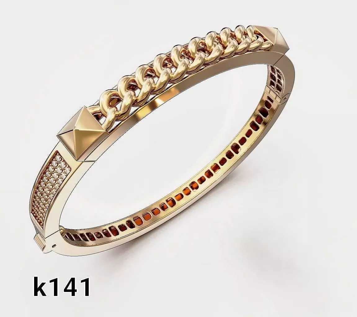 This high-end 3D bracelet model features a bold and modern design that combines classic chain elements with sharp geometric accents. The upper section showcases detailed interlocking chain links, complemented by pyramid-shaped studs and a pave-set stone segment that adds a refined luxury touch.