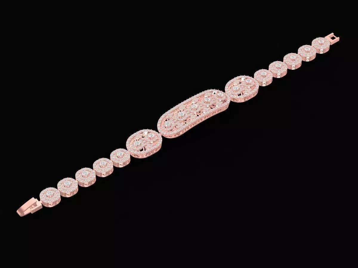The Elegant Linked Round Pattern Bracelet Design features a detailed sequence of circular and oval elements connected in a smooth, flexible layout. The central piece showcases an oval-shaped decorative plate fully set with small accent stones, creating an eye-catching focal point. Each round link includes delicate openwork motifs, enhancing the bracelet’s refined and artistic appearance while maintaining structural strength.
