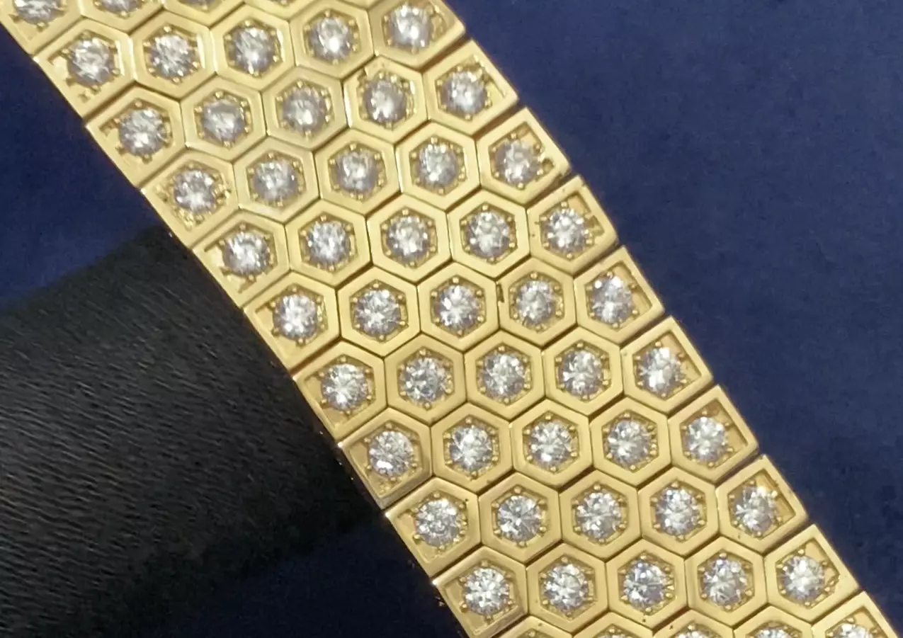 You will need 0.75 mm wire to assemble the bracelet.The thickness of the model walls is 0.30 and the floor is 0.40 mm.The thickness of the stone prongs is 0.60200 round stones 2.5 mmThe inner part of the spring for the lock must be at least 1 mm.This model was printed with a rapidshape printer, the stones were mounted on resin, and then cast, and it is flawless.Take a closer look at this stunning gold bracelet featuring a unique hexagonal (honeycomb) pattern, with a brilliant diamond set at the center of each segment. This luxurious piece combines precision craftsmanship with modern elegance, making it a perfect example of high-end jewelry design.