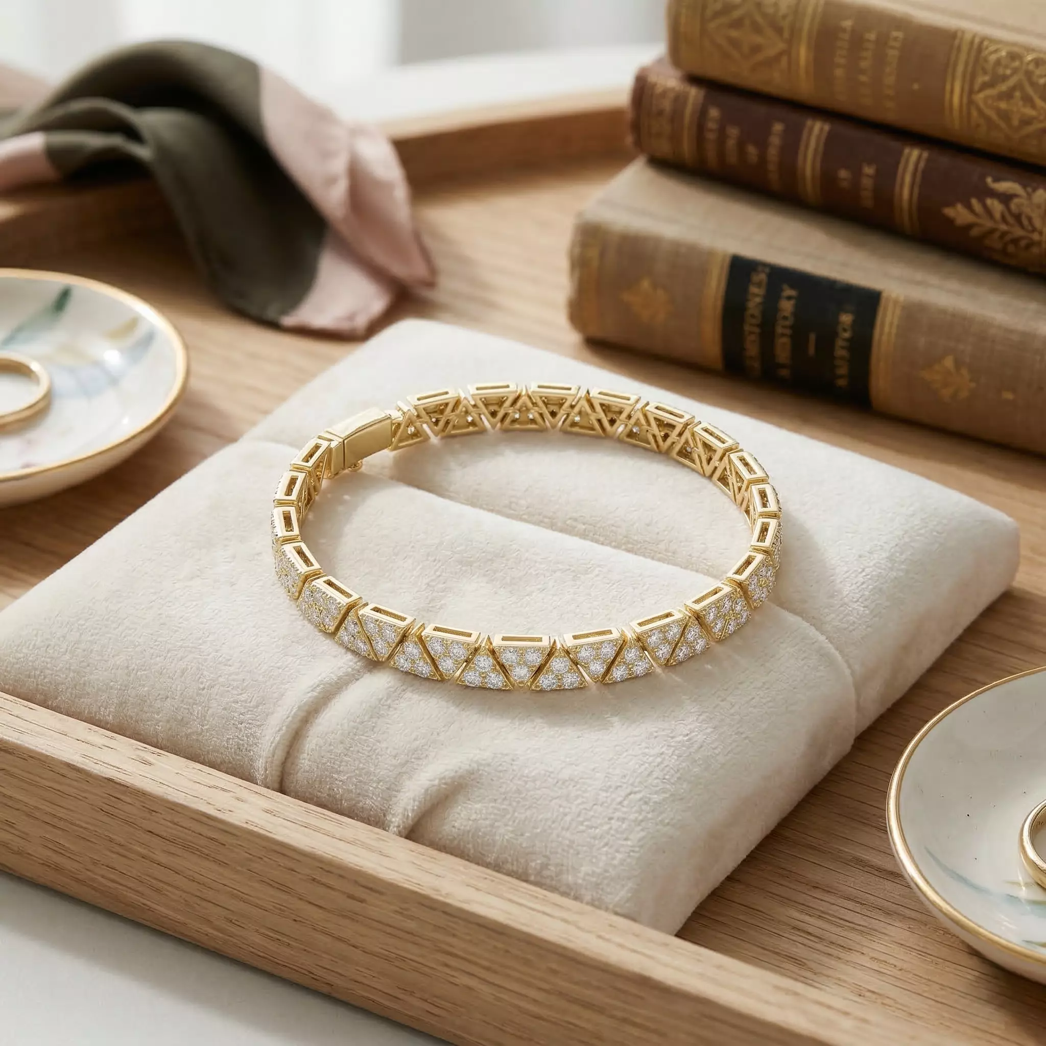 The combination of clean geometric symmetry, polished gold edges, and diamond pavé surfaces creates a highly sophisticated bracelet ideal for luxury jewelry collections and statement designer pieces.