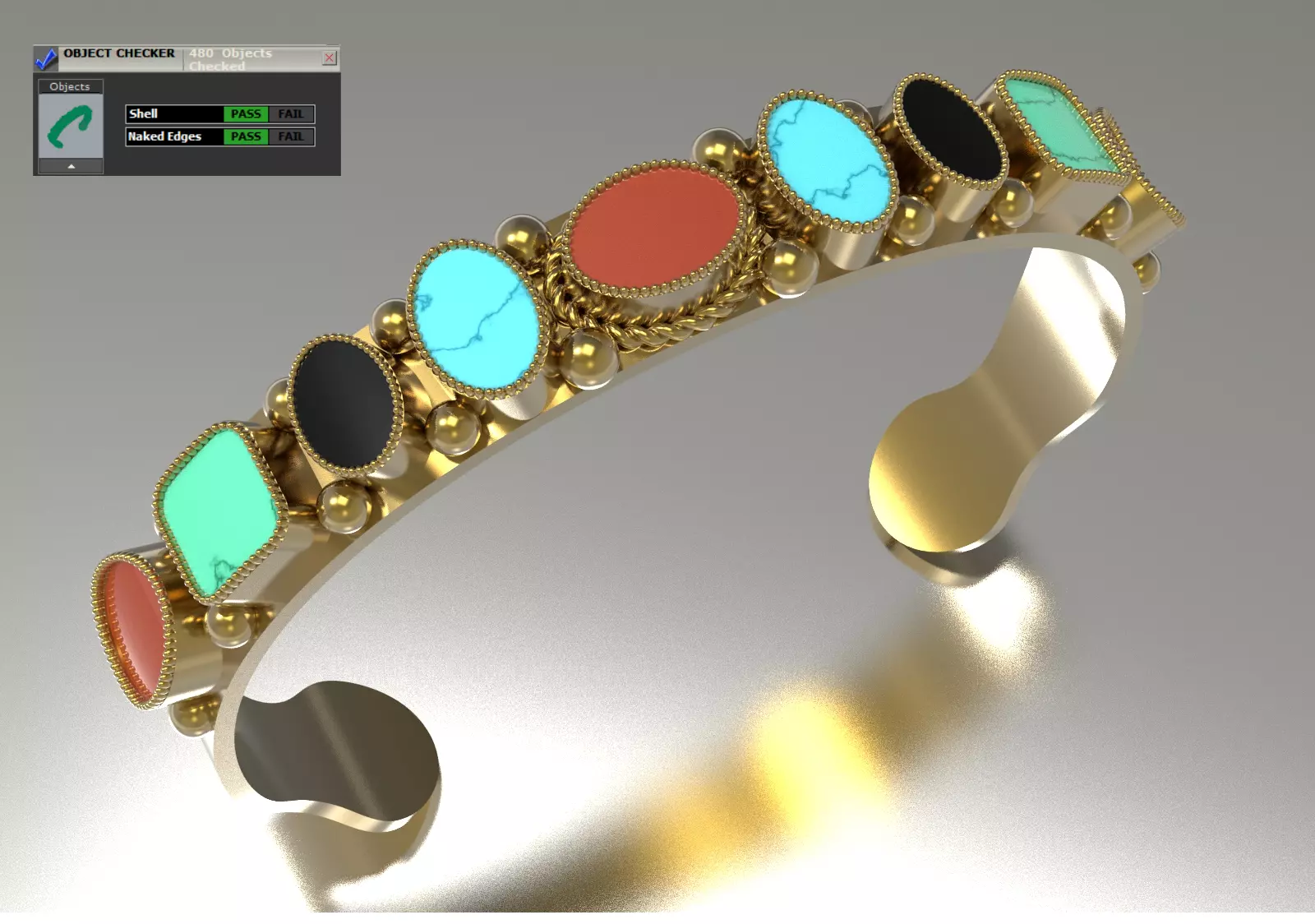 Stone Variety: The top surface of the bracelet is decorated with a continuous row of Various Colored Gemstones (such as Blue Turquoise, Green Turquoise, Black Onyx, and Red Coral).