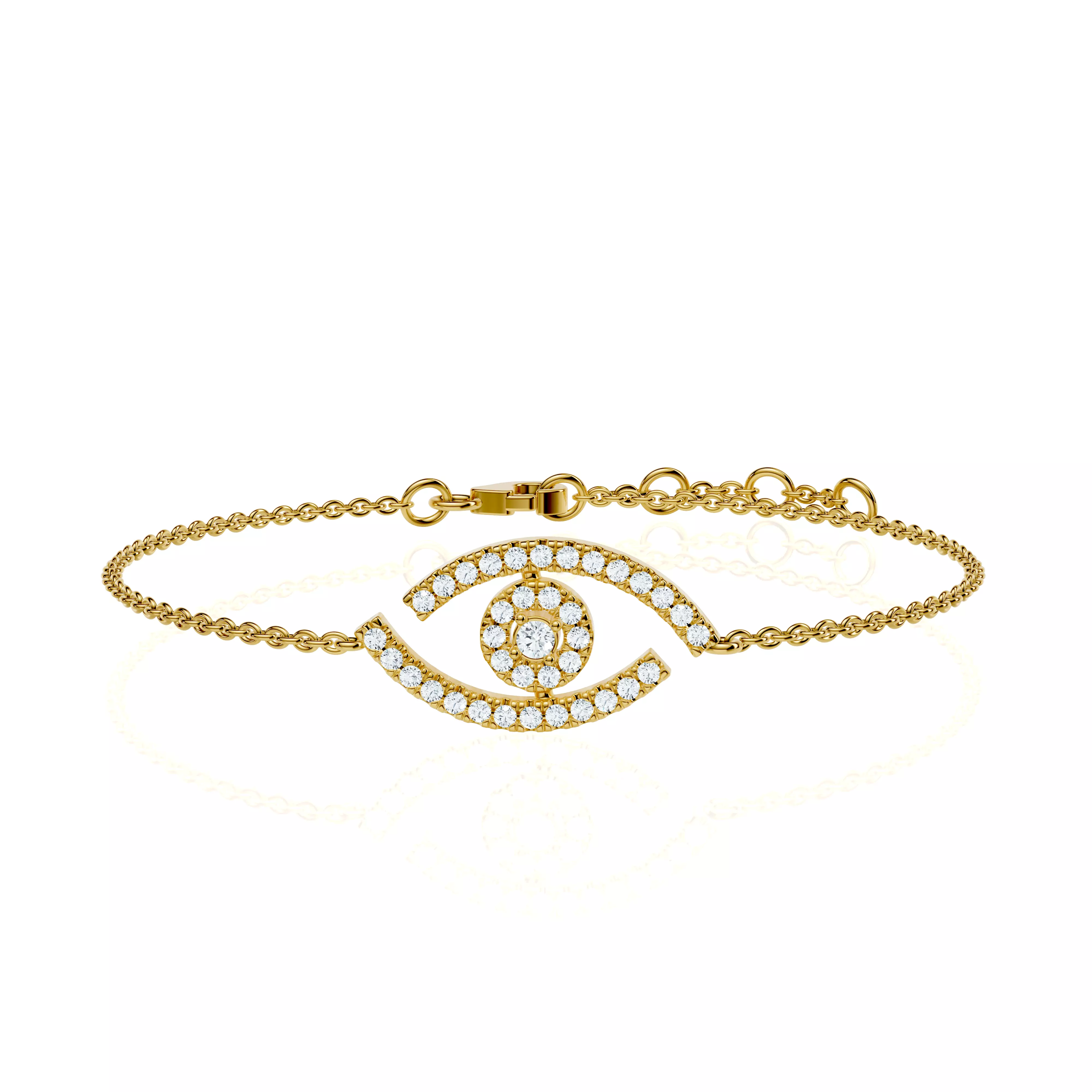 This elegant Evil Eye bracelet features a luxurious pavé diamond design with a detailed open evil eye centerpiece. The curved eye shape is decorated with small round stones and a central diamond, creating a modern and sophisticated protective jewelry design.