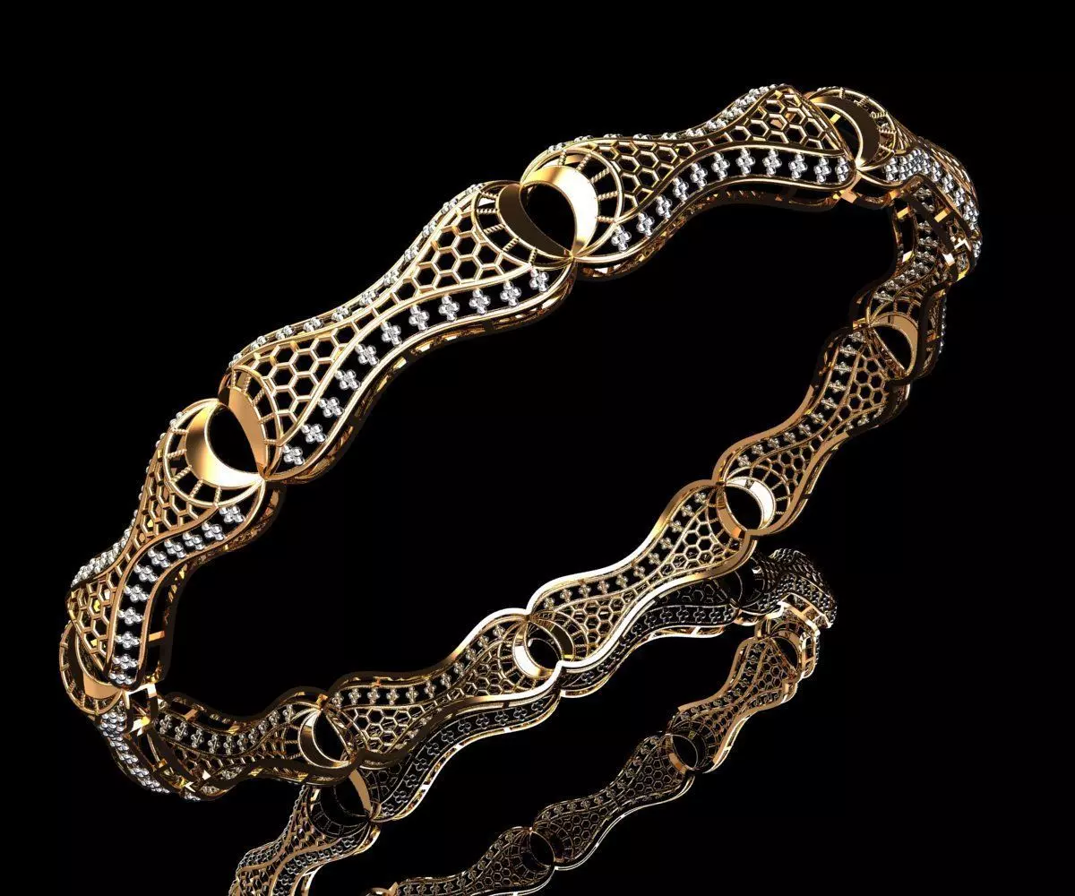 This 3D model presents a beautifully crafted gold bangle, designed to add a touch of sophistication and tradition to any ensemble. The bangle features an intricate pattern of floral motifs and geometric designs, meticulously engraved to highlight the fine craftsmanship. The surface is polished to a high shine, enhancing the rich, warm glow of the gold.