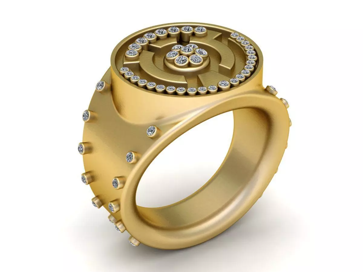 A perfect blend of modern architecture and luxury jewelry, this ring is crafted for those who love statement pieces with strong character. The maze-like top design symbolizes focus, determination, and the journey of life, while the diamond accents bring brilliance and refinement. Its thick gold band ensures durability and comfort, making it ideal as a fashion statement ring, men’s luxury accessory, or collector’s piece. This model reflects both creativity and craftsmanship, appealing to clients who seek distinctive jewelry beyond