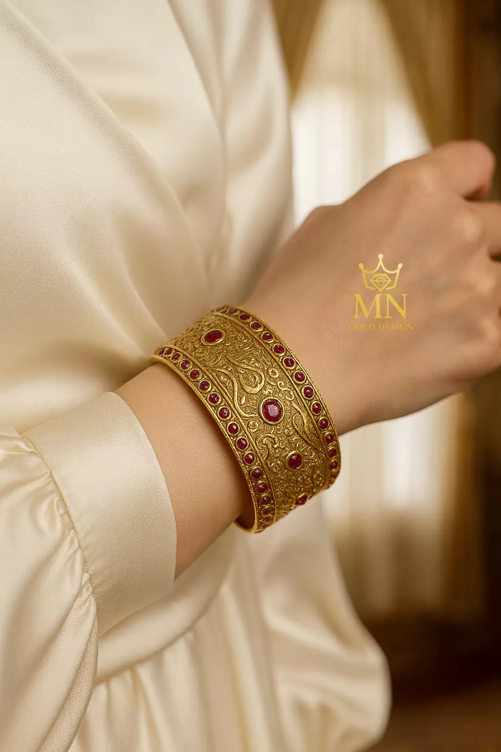 This exquisite Royal Ruby Calligraphy Cuff is a luxurious Middle Eastern–inspired gold bracelet designed with meticulous ornamental engravings and elegant ruby placements. The piece features hand-carved floral arabesque patterns blended with classic calligraphic motifs, giving it a timeless royal character.