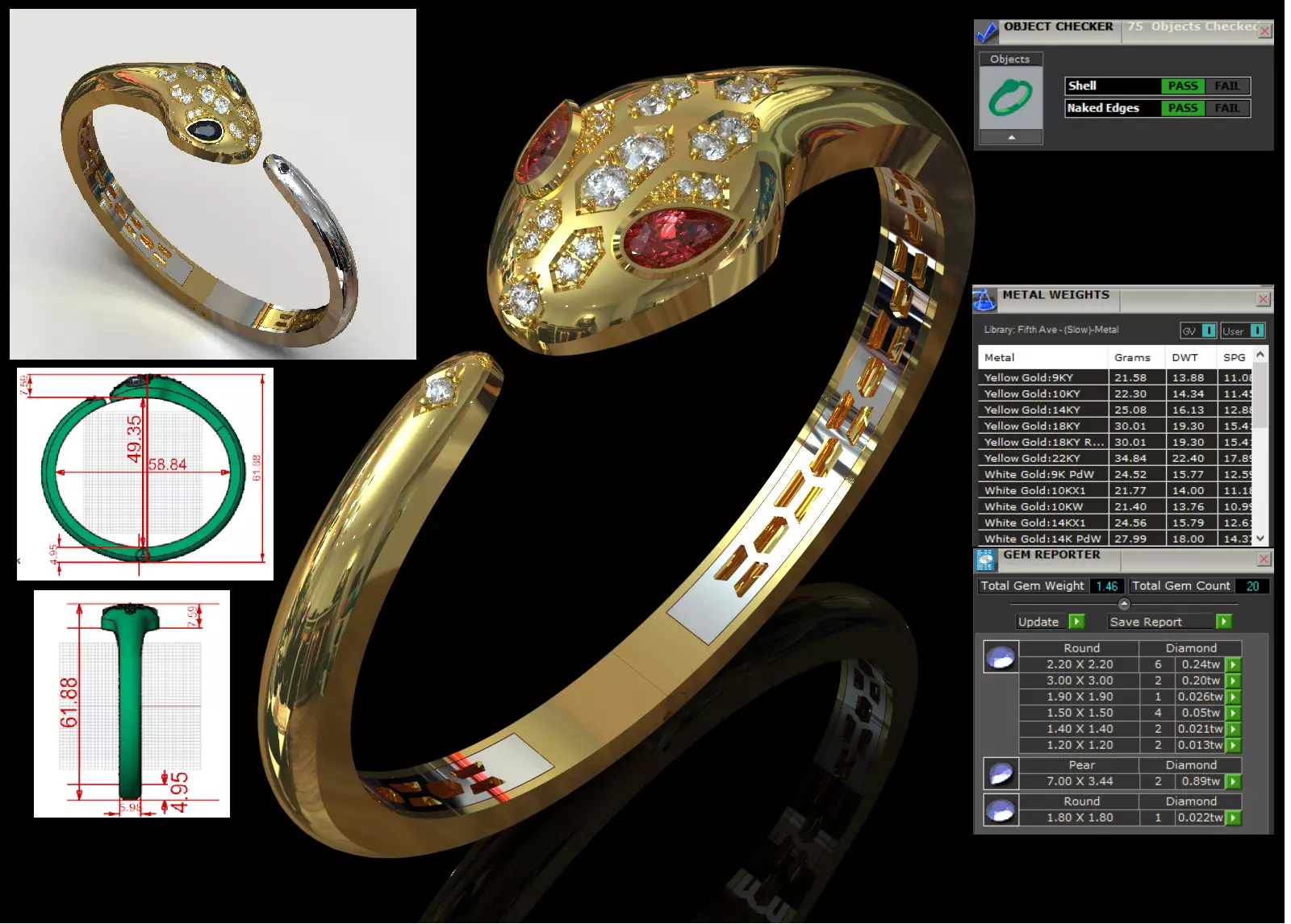 BG0061: Serpent Cuff Bangle with Diamond and Ruby Embellishment, Symbolizing Animal Power, Luxury and EleganceThe BG0061 bracelet is a Cuff Bangle or Spring with a design inspired by the Serpent motif. This piece focuses on fluid curves, snake head details and the combination of colored stones, and offers a party, mysterious and very luxurious look.
