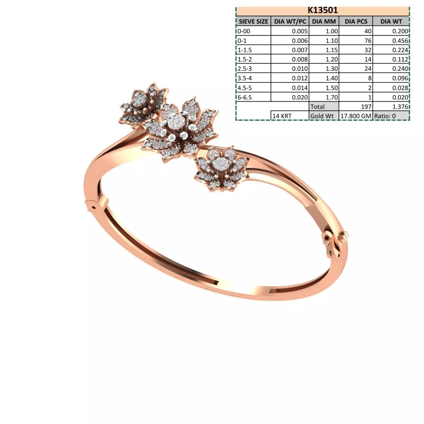 The bracelet features a floral-inspired Toi et Moi (You and Me) style design with three blooming lotus-like flowers.Metal Tone: Rose Gold finish, which complements the diamond settings.Style: An open-ended cuff or bypass bangle, featuring a hinge mechanism on one side and a secure clasp on the other.Motif: The flowers are intricately pavé-set with diamonds to maximize brilliance across the petals.We are offering cad models of......