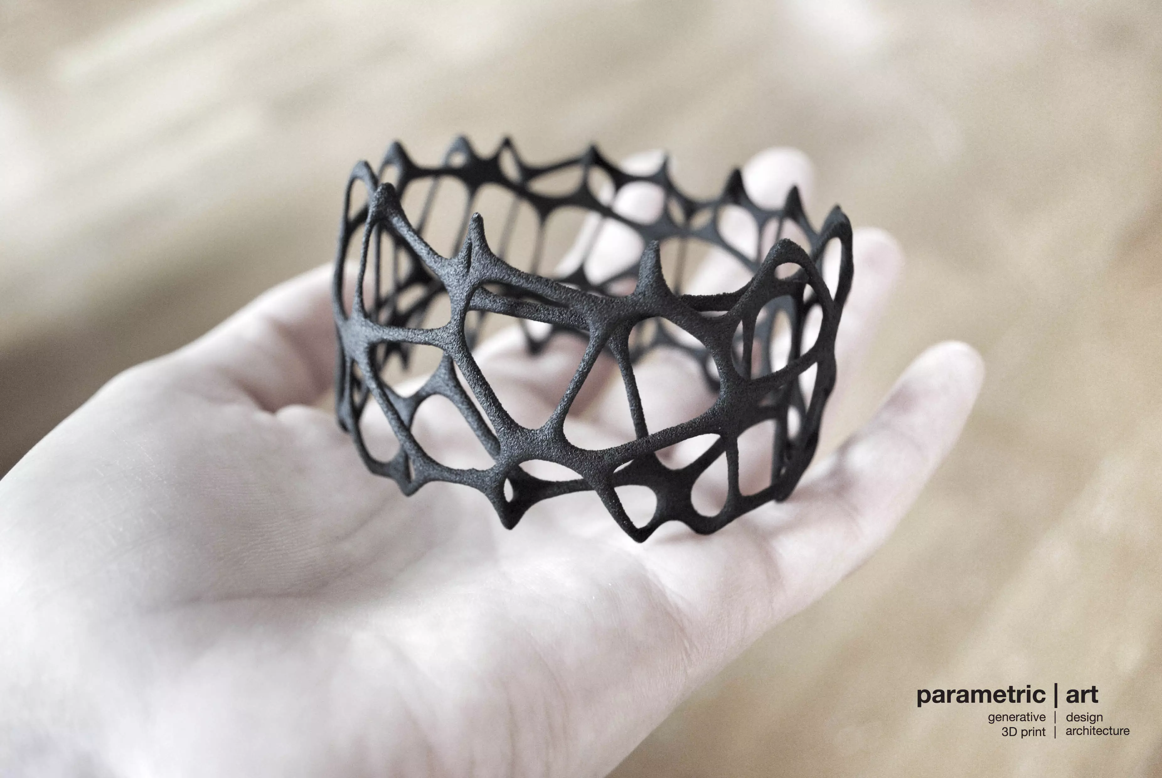 Organic cellular shaped generative voronoi bracelet, designed computational using parametric 3d modeling tools like Grasshopper and Blender. If you want the best results, 3d print it with strong and flexible nylon (PA) material using selective laser sintering technology, although it also works on a well-calibrated FDM 3dprinter at 100 micron layer height (it is a nightmare to remove supports, see attached pictures). Extremely lightweight, comfortable to wear, and curvy: this geometry only can be produced with additive manufacturing technologies, like 3d printing or vacuum casting. You can see more of my projects on my blog: http://parametric-art.com
