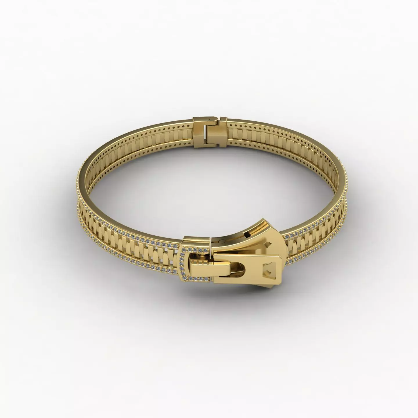 Modern gold bracelet design with an integrated hidden mechanical clasp.With a zipper design that is closed at the end and shows the zipper half-open at the front.