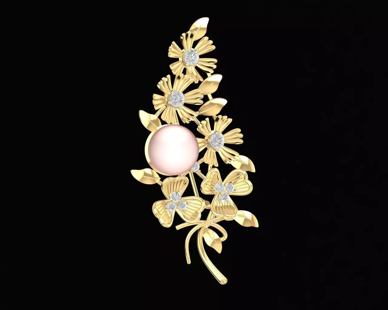 This elegant floral brooch features a graceful arrangement of layered flowers and leaves, highlighted by a central pearl element that creates a refined and feminine focal point. The flowing botanical composition delivers a natural sense of movement while maintaining a balanced and harmonious structure suitable for luxury jewelry collections.