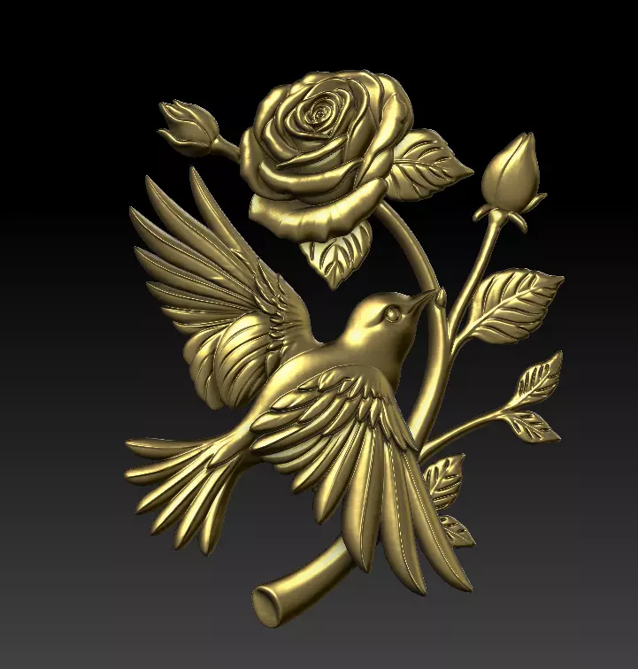 This brooch features a bird in mid-flight combined with a rose and foliage, sculpted in full round 3D with clean volumes and refined relief details. Feather layers, petals, and stems are clearly defined, ensuring sharp readability after casting and polishing.