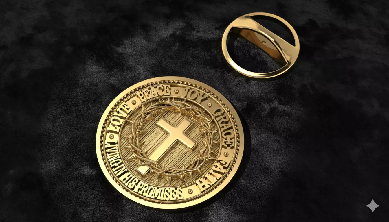 A masterpiece of devotion, this premium gold-plated brooch captures the profound essence of the Crucifixion with sophisticated artistry. At its heart lies the Cross, encased within a meticulously detailed Crown of Thorns, symbolizing the ultimate sacrifice. The outer ring is engraved with the foundational pillars of the faith—Love, Peace, Joy, Grace, and Faith—encircling the central message: Living in His Promises.