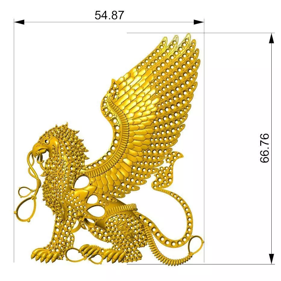 High-Detail Persian Griffin Jewelry 3D ModelThis is a premium, high-fidelity 3D model of a Persian Griffin, inspired by ancient Achaemenid art. Designed specifically for the luxury jewelry market, this model combines the majestic features of a lion and an eagle with intricate detailing and precision.Model Highlights:Artistic Design: Features a textured mane, detailed feather patterns on the wings, and a dynamic mythological pose.Production Ready: The mesh is clean, manifold, and optimized for high-resolution 3D printing (SLA/DLP/LCD).Gemstone Friendly: The body and wings are designed with pre-set holes for micro-pave stone setting, saving hours of CAD work for the bench jeweler.Versatility: Ideal for a large statement pendant, luxury brooch, or a decorative furniture ornament.Technical Specifications:Width: 54.87 mm (as shown in the dimension line).Geometry: High-poly for maximum detail retention during casting.File Formats: STL, OBJ,