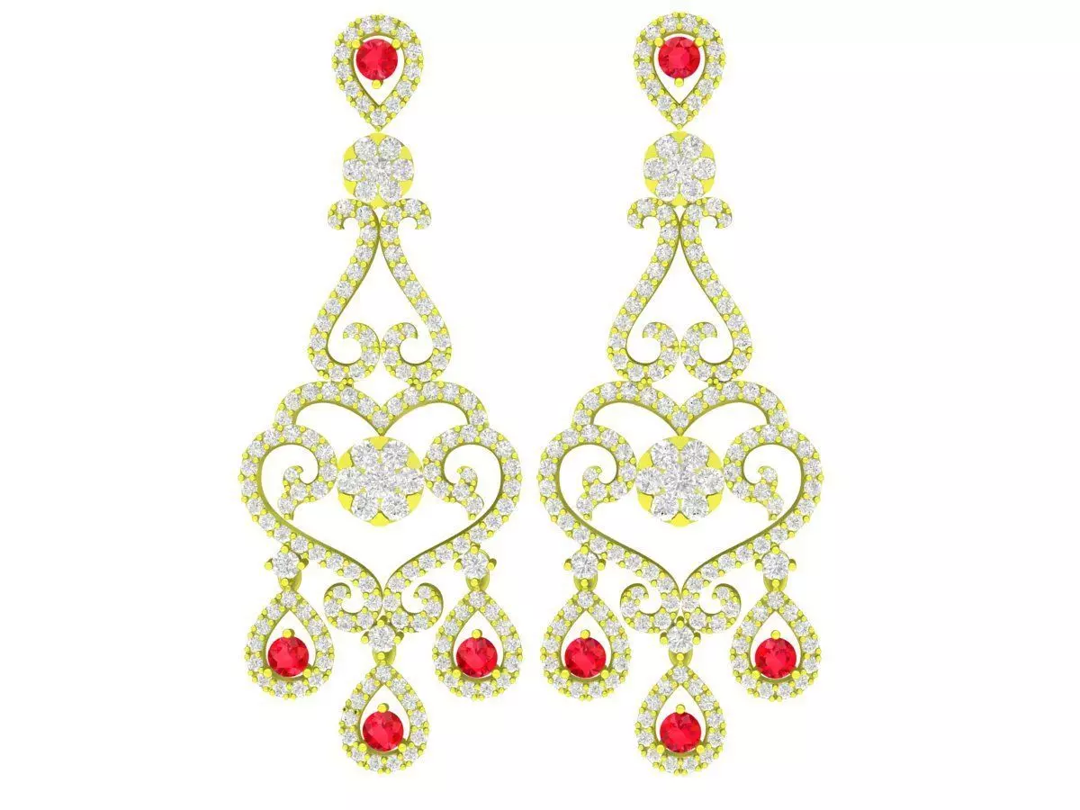 This elegant heart chandelier earrings 3D model features an ornate open-heart centerpiece combined with multiple dangling gemstone drops. The layered structure creates a luxurious, eye-catching silhouette while maintaining refined balance and symmetry.