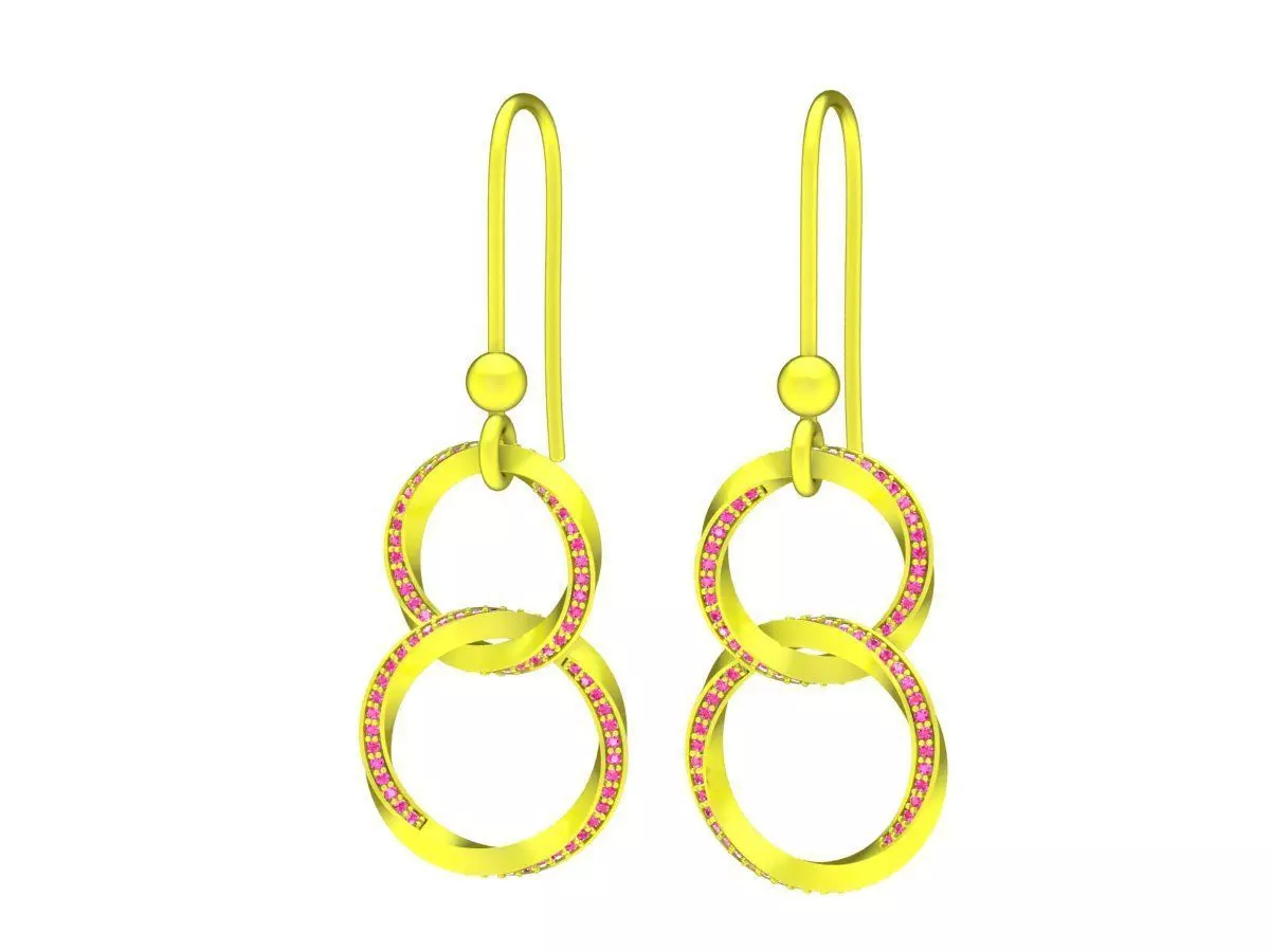 This 3D model features a pair of luxury double hoop drop earrings with a clean and modern design. The earrings consist of two interlinked circular hoops suspended from elegant hook-style ear wires, creating a balanced silhouette with smooth movement and refined proportions. The subtle surface detailing adds visual interest while maintaining a timeless aesthetic.