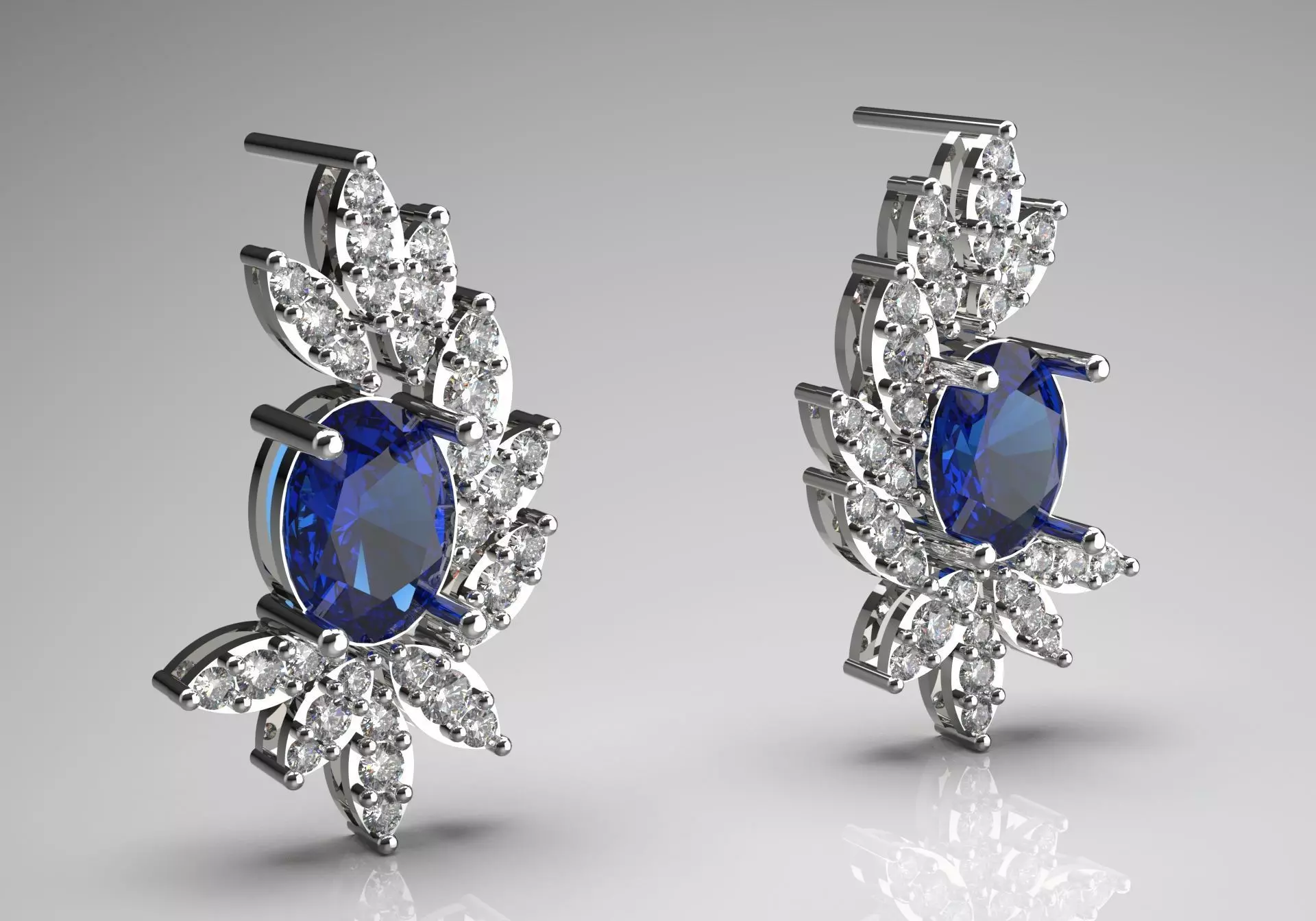These earrings are a beautiful blend of elegance and sophistication, showcasing a striking design that features a high-quality deep blue sapphire center gemstone. The oval shape of the center gemstone is perfectly proportioned, allowing it to reflect light dramatically, creating a rich, vibrant color that commands attention.