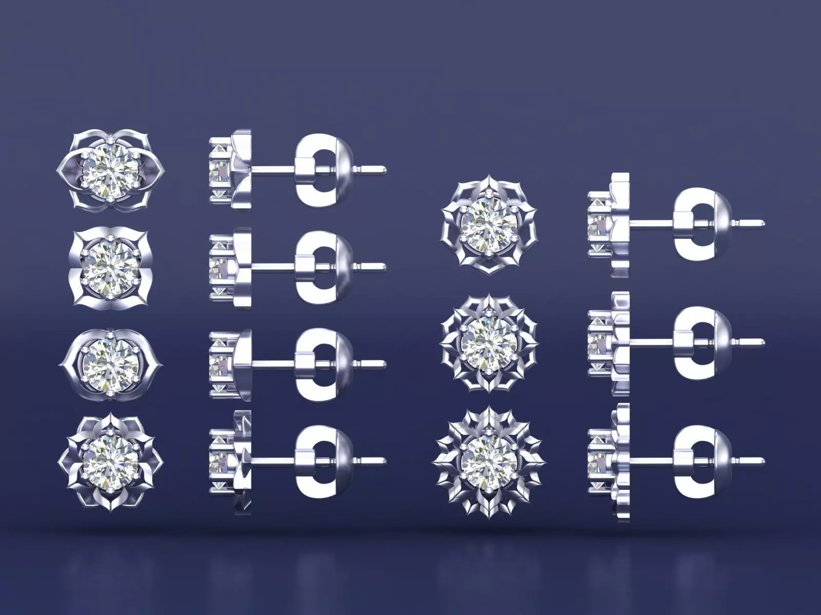 Chakra Diamond Stud Earrings CAD DesignDesign VariationsThe earrings have unique settings that resemble floral or geometric patterns, adding elegance and sophistication to the design.Each setting holds a central diamond, highlighting its brilliance and sparkle.